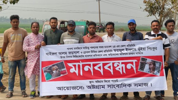কিশোরগঞ্জে সাংবাদিকদের ওপর হামলার প্রতিবাদে অষ্টগ্রামে মানববন্ধন
