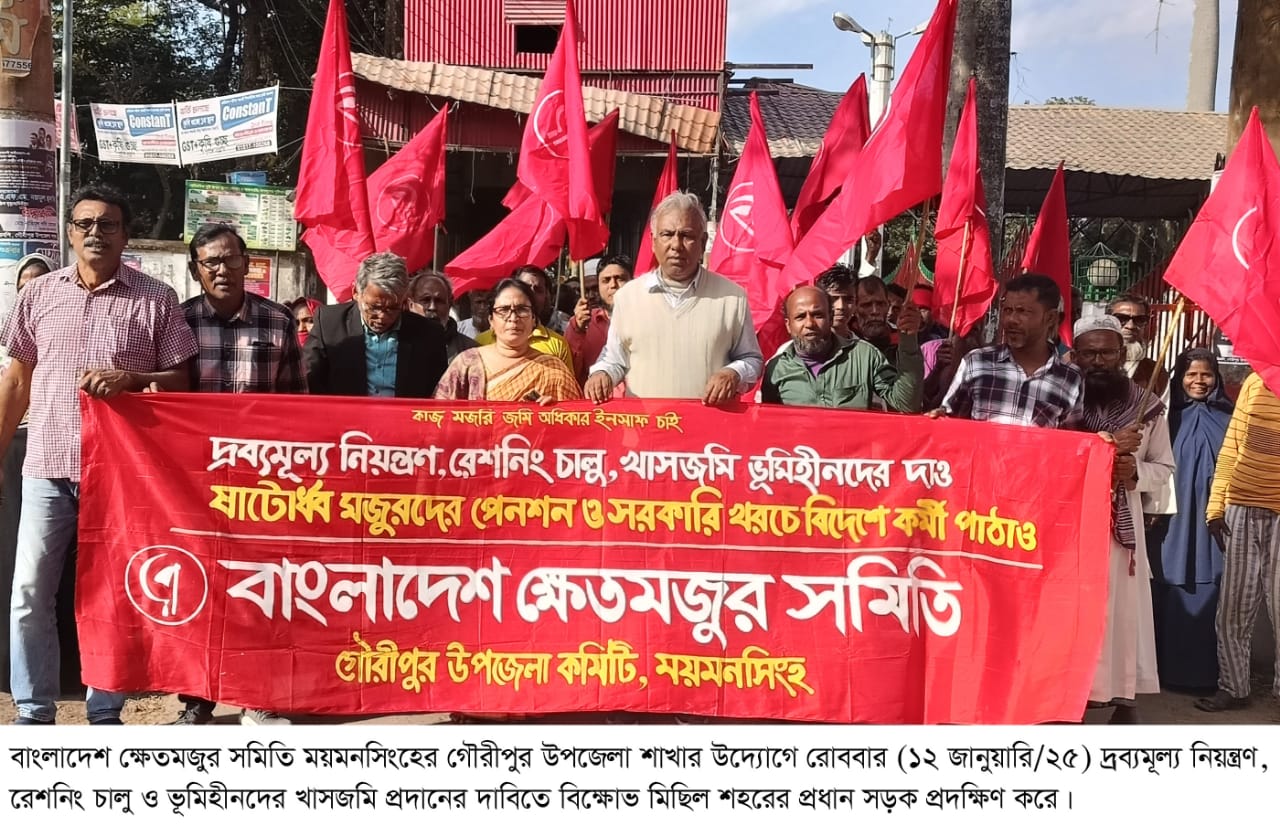বাংলাদেশ ক্ষেতমজুর সমিতি ময়মনসিংহের গৌরীপুর উপজেলা শাখার উদ্যোগে রোববার (১২ জানুয়ারি/২৫) উপজেলার সিধলং বিলের ইজারা বাতিল, বরাদ্দকৃত ভূমিহীনদের খাসজমি বুঝিয়ে দেয়া, দ্রব্যমূল্য নিয়ন্ত্রণ, ক্ষেতমজুরদের জন্য রেশন ও পেনশন চালুকরণ, সরকারের প্রকল্পের দুর্নীতিবন্ধকরণ, প্রকৃত সুবিধাভোগীদের তালিকা প্রণয়ন, টিসিবি চালুকরণসহ ৭দফা দাবিতে স্মারকলিপি প্রদান ও বিক্ষোভ মিছিল শহরের প্রধান সড়ক প্রদক্ষিণ করে। স্মারকলিপি গ্রহণ করেন উপজেলা নির্বাহী অফিসার এম সাজ্জাদুর হাসানের পক্ষে প্রশাসনিক কর্মকর্তা মো. হৃদয় মিয়া।