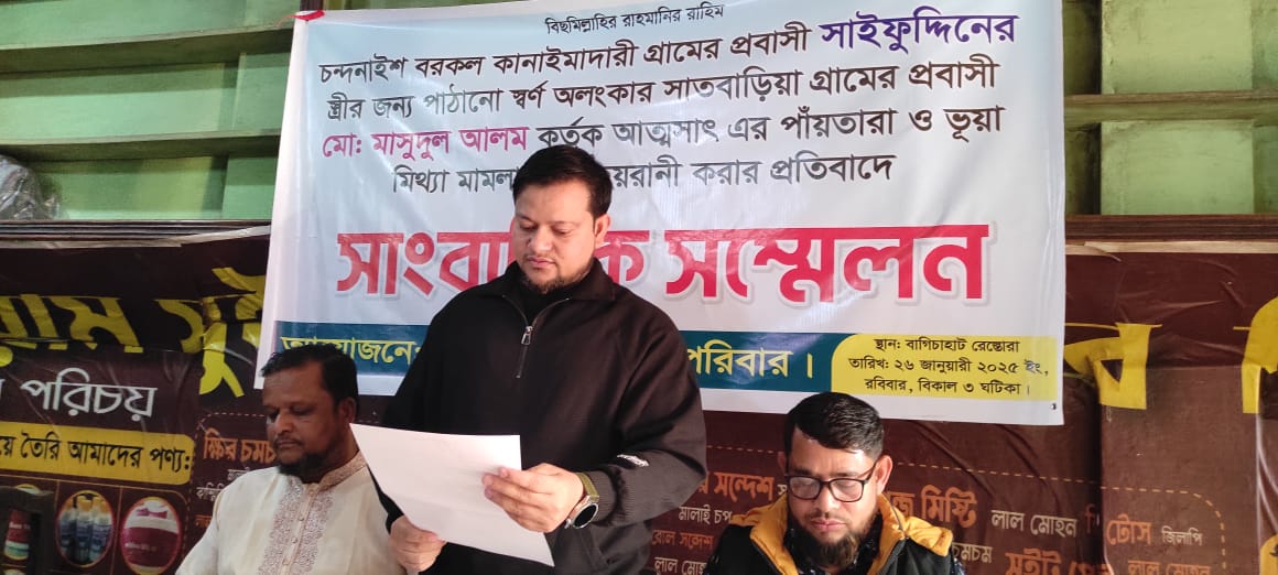 চট্টগ্রামের চন্দনাইশে প্রবাসীর স্বর্ণ আত্মসাৎ এর প্রতিবাদ মিথ্যা মামলায় হয়রানি বন্দের দাবীতে সংবাদ সম্মেলন অনুষ্ঠিত হয়। রবিবার বিকাল ৩ টায় উপজেলার বাগিচার হাট আরফাত হোটেল এন্ড রেস্টুরেন্টে এই সংবাদ সম্মেলন হয়। জানা যায় ডুবাই প্রবাসী মোঃ সাইফুদ্দীন বাড়িতে তার স্ত্রীর নিকট স্বর্ণ পাঠানোর জন্য ছোট ভাই প্রবাসী জাহেদের মাধ্যমে সাইফুল তার বন্ধু প্রবাসী মাসুদুল আলমের নিকট ৮ ভরি স্বর্ণালংকার একটি আইপ্যাড আমানত হিসাবে বাড়িতে পৌঁছে দেওয়ার জন্য দেন। যার মূল্য দেশীয় মুদ্রায় ১০,২০,৯০০ টাকা। কিন্তু মাসুদুল আলম ৭ই জানুয়ারি দেশে আসলে তার মোবাইল ফোন বন্ধ করে দেন। ৯ই জানুয়ারি মাসুদুল আলমের স্ত্রীর সাথে যোগাযোগ করা হলে সে জানায় তার স্বামীকে কে বা কারা সাড়ে ৮ ভরি স্বর্ণালংকার ও একটি আইপ্যাড সহ অপহরণ করে কুমিল্লা নিয়ে গেছে। আমরা কুমিল্লা যাওয়ার চেষ্টা করলে মাসুদুল এর স্ত্রী খুশি সুকৌশলে স্বর্ণালংকার ও আইপ্যাড আত্মসাৎ করার পরিকল্পনা পরবর্তীতে আমরা বুঝতে পারি। মাসুদুল আলম বাড়িতে আছে সংবাদ পেয়ে আমি আমার বড় ভাই খোরশেদুল আলম (এম. ইউ. পি), দিদারুল আলম ও একজন চৌকিদার সহ বাড়িতে উপস্থিত হয়ে মাসুদুল এর সাথে কথা বললে সে ঘটনার সত্যতা স্বীকার করে মালামাল ফেরৎ দেওয়ার কথা স্বীকার করেন। পরবর্তীতে মাসুদুল আলম না দেওয়ার জন্য তালবাহানা শুরু করলে আমি চন্দনাইশ থানায় একখানা অভিযোগ দায়ের করি। এছাড়াও বিজ্ঞ চীফ জুডিশিয়াল চট্টগ্রাম হাকিম এর আদালতে মাসুদুল আলম (৪০) স্ত্রী মোছাম্মৎ খুশি আক্তার (৩৫) মোছাম্মৎ কুলছুম(৩৫) পিতা- আহমুদুর রহমান, সর্বসাং - সাতবাড়িয়া তাদের বিরুদ্ধে মামলা দিলে তারা ষড়যন্ত্র মূলক ভাবে মাসুদুল আলম বাদী হয়ে আমাকে ও আমার পরিবারের অন্যাদের বিরুদ্ধে চীফ জুডিসিয়াল ম্যাজিস্ট্রেট এর আদালত চট্টগ্রামে একটি মামলা দায়ের করেন। সি আর মামলা নং ৩১। অপর মামলাটি সাইফুল আলমের স্ত্রী খুশি আক্তার বাদী হয়ে অপর একটি মামলা চট্টগ্রাম চীফ জুটিশিয়াল ম্যাজিস্ট্রেট এর আদালতে আমি ও আমার পরিবারের সকলকে আষামী করে দায়ের করেন। মামলা নং ৫০। প্রতিনিয়ত তারা আমাকে ও আমার পরিবারকে হয়রানি করছে। আমি সংবাদ সম্মেলনের মাধ্যমে প্রশাসনের নিকট ন্যায় বিচার চাই। প্রশাসন যাতে আমার স্বর্ণালংকার ও আইপ্যাড উদ্বার করে দিতে পারেন। প্রশাসনের নিকট এই আবেদন করছি।