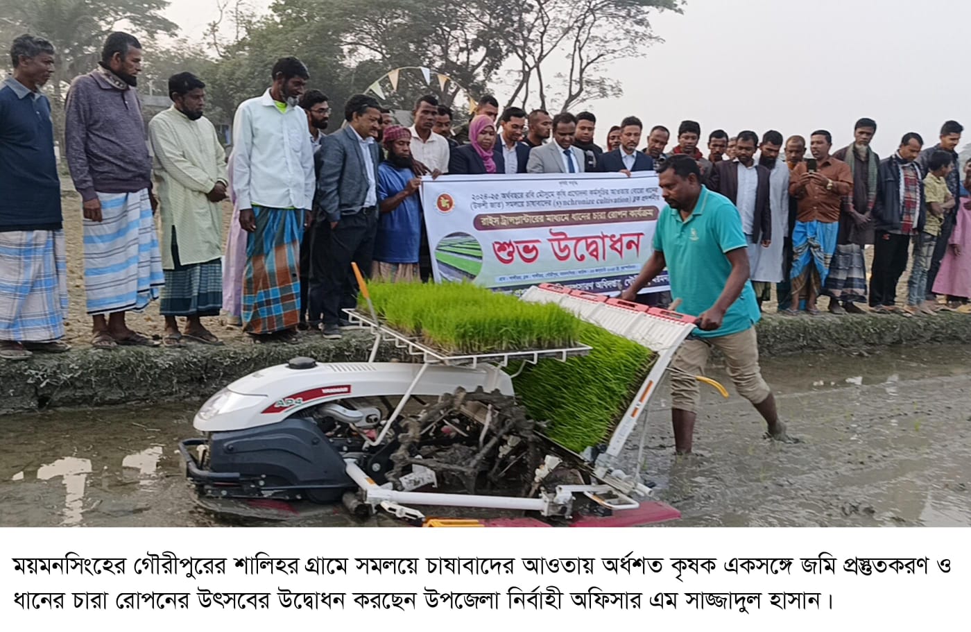 কৃষকের একতায় একসঙ্গে এক মাঠে একই ফসল আর শ্রমিক ছাড়াই মেশিনে জমির চাষাবাদ ও ধানের চারা রোপন হচ্ছে এখন ময়মনসিংহের গৌরীপুরে। উপজেলার ২নং গৌরীপুর ইউনিয়নের শালিহর গ্রামে ২০২৪-২৫অর্থবছরে রবি মৌসুমে কৃষি প্রণোদনা কর্মসূচির আওতায় বোরো ধানের (উফশী জাত) সমলয়ে চাষাবাদের ব্লক প্রদর্শনীর আওতায় এ কর্মসূচির মাধ্যমে শালীহর ব্লকে অর্ধশত কৃষক একসঙ্গে জমি প্রস্তুতকরণ ও ধানের চারা রোপনের উৎসব পালন করেন।