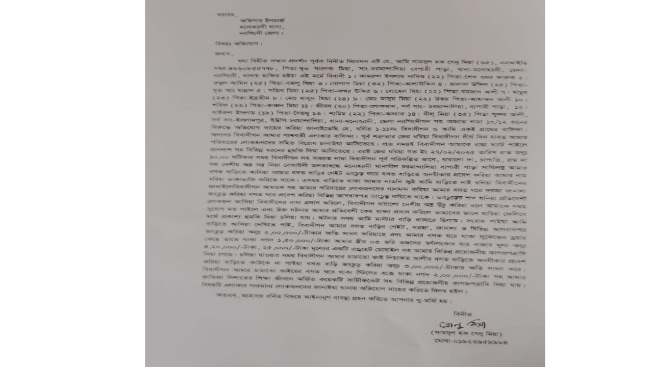 বৃহস্পতিবার(২৭ ফেব্রুয়ারী)রাতে পূর্ব শত্রুতার জেরে বিবাদীরা দেশীয় অস্ত্র নিয়ে বাদী,র বাড়ীতে আকস্মিক আক্রমণ করে বাড়ী-ঘর ও ঘরে ঢুকে আসবাবপত্র ভাংচুর করে এবং বাদীকে পেলে প্রাণে মেরে ফেলার হুমকী দেয়। এ সময় শব্দ পেয়ে আশে-পাশের প্রতিবেশীরা বিবাদীদের বাঁধা দিতে আসলে বিবাদী,রা তাদের উপর চড়াও হয় এবং এ ব্যাপারে কাওকে স্বাক্ষী না দিতে ভয়ভীতি প্রদর্শন করে।