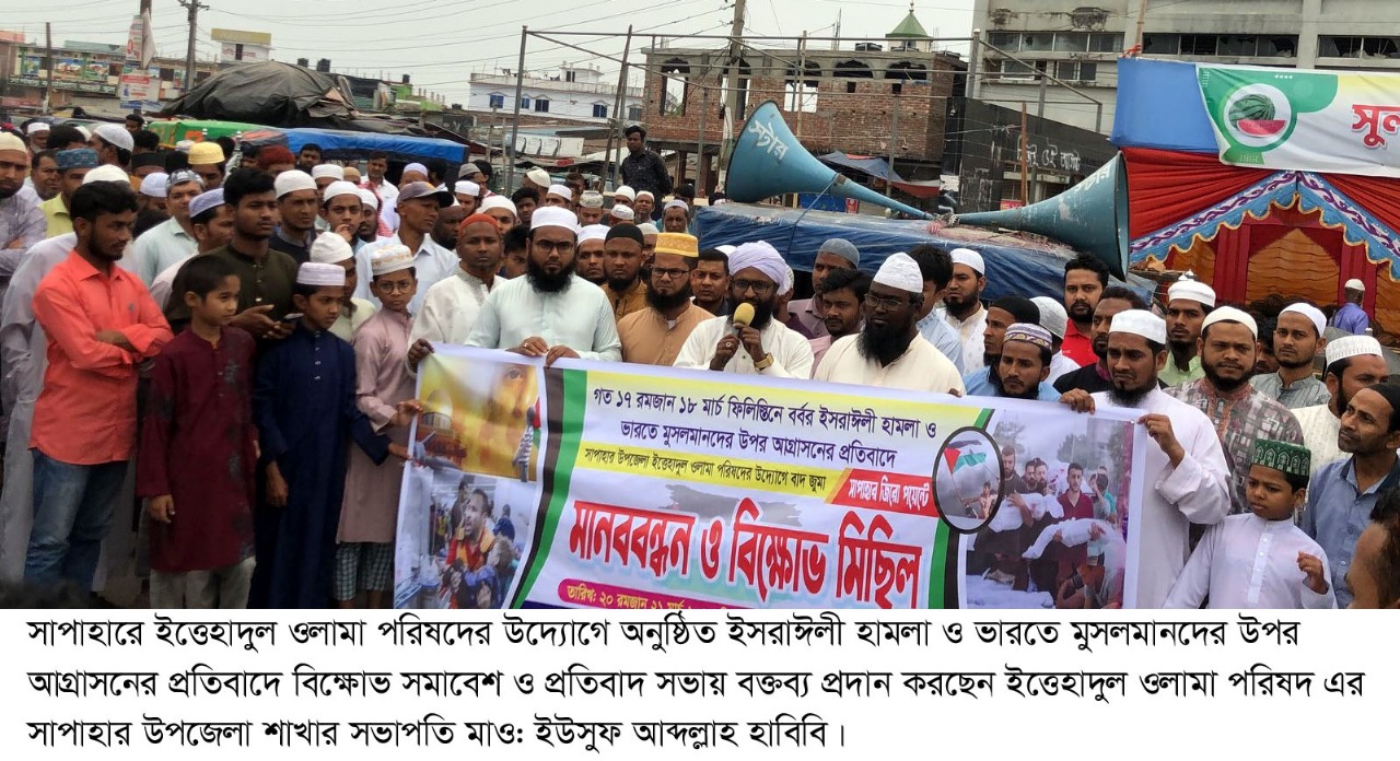 স্টাফ রিপোর্টারঃ ফিলিস্তিনে বর্বর ইসরাঈলী হামলা ও ভারতে মুসলমানদের উপর আগ্রাসনের প্রতিবাদে নওগাঁর সাপাহারে ইত্তেহাদুল ওলামা পরিষদ এর উদ্যোগে মানববন্ধন,বিক্ষোভ ও প্রতিবাদ সভা অনুষ্ঠিত হয়েছে।