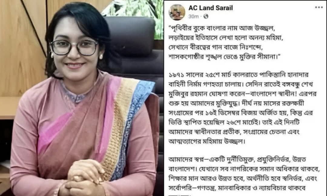শেখ মুজিবুর রহমানকে স্বাধীনতার ঘোষক দাবি করে ব্রাহ্মণবাড়িয়ার সরাইল উপজেলা সহকারী কমিশনার (ভূমি) সিরাজুম মুনিরা কায়ছান ফেসবুকে পোস্ট দেওয়া হয়েছে। তবে তার দাবি পোস্টটি ফেসবুক হ্যাক করে দেওয়া হয়েছে।