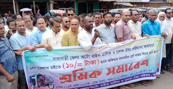 রাজবাড়ীতে অটোরিক্সা চলাচলের জন্য পৌর পার্কিং প্রথা বাতিল করে নম্বর প্লেট দেওয়ার দাবি জানিয়েছেন চালকরা। বুধবার এ দাবিতে শহরে বিক্ষোভ মিছিল ও সমাবেশ হয়েছে। পরে তারা রাজবাড়ী জেলা প্রশাসকের কাছে স্মারকলিপি দেয়। আগামী ১ বৈশাখ থেকেই তাদের দাবি কার্যকর করার দাবি জানিয়েছে। বেলা ১১টায় রাজবাড়ী শহরের রেলগেট এলাকায় অটোরিক্সা চালকরা জমায়েত হয়ে বিক্ষোভ সমাবেশ করে। সমাবেশে অটোরিক্সা চালকদের সাথে একাত্মতা প্রকাশ করে বক্তৃতা দেন রাজবাড়ী জেলা বিএনপির সাবেক আহবায়ক নঈম আনসারী, জেলা অটো মালিক ও চালক ঐক্য পরিষদের সভাপতি মো. হাফিজুর রহমান, জাতীয়তাবাদী শ্রমিক দলের রাজবাড়ী জেলা শাখার সভাপতি আব্দুল গফুর মন্ডল, সাধারণ সম্পাদক শাহ আলম, কৃষক দলের আহবায়ক আইয়ুবুর রহমান, জেলা যুবদলের আহবায়ক খাইরুল আনাম বকুল, বাংলাদেশ শ্রমিক কল্যাণ ফেডারেশন রাজবাড়ী জেলা শাখার সাধারণ সম্পাদক কবির উদ্দীন প্রমুখ। অটোচালকরা বলেন, রাজবাড়ীতে প্রতিদিন পৌর পার্কিং ফির নামে ৩০ থেকে ৪০ টাকা চাঁদা আদায় করা হচ্ছে। এটা তাদের জন্য বাড়তি বোঝা। শ্রমিকদের জন্য খুবই কষ্টসাধ্য। প্রতিদিন যা আয় হয় তা দিয়ে সংসারই চলেনা। এর উপর পার্কিং ফি দিয়ে দিলে আরও করুণ অবস্থায় পড়তে হয় তাদের। রাজবাড়ীর প্রতিবেশি জেলা ফরিদপুর ও কুষ্টিয়ায় অটোরিকশার পার্কিং ফি অনেক কম। সেখানে নির্দিষ্ট পরিমাণ টাকা নিয়ে নম্বর প্লেট দেওয়া হয়। রাজবাড়ীতেও এ নিয়ম