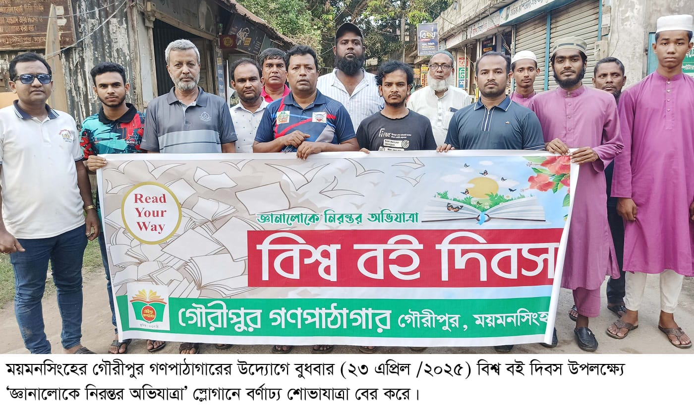 ময়মনসিংহের গৌরীপুর গণপাঠাগারের উদ্যোগে বুধবার (২৩ এপ্রিল /২০২৫) বিশ্ব বই দিবস উপলক্ষ্যে ‘জ্ঞানালোকে নিরন্তর অভিযাত্রা’ স্লোগানে বর্ণাঢ্য শোভাযাত্রা বের করে। শোভাযাত্রা শেষ সংগঠনের কার্যালয়ে বইপড়ার গুরুত্ব তুলে ধরে আলোচনা সভা অনুষ্ঠিত হয়।