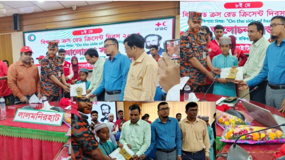 লালমনিরহাট রেড ক্রিসেন্ট সোসাইটি আয়োজিত চিত্রাংকন প্রতিযোগিতায় লালমনিরহাট রেসিডেন্সিয়াল মডেল মাদ্রাসার তিনজন বিজয়ী শিক্ষার্থীদের হাতে পুরস্কার তুলে দেন অনুষ্ঠানের প্রধান অতিথি লালমনিরহাটের জেলা প্রশাসক এইচ এম রকিব হায়দার, ও রেড ক্রিসেন্ট সোসাইটির কর্মকর্তারা।