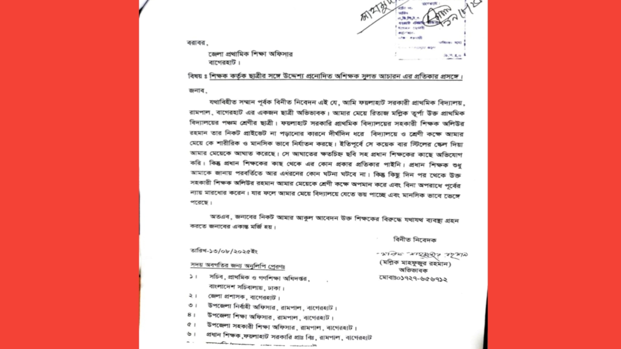 রামপালে ফয়লাহাট সরকারি প্রাথমিক বিদ্যালয়ের এক শিক্ষকের বিরুদ্ধে উদ্দেশ্যপ্রণোদিত ও অশোভন আচরণের অভিযোগ উঠেছে। অভিযোগকারী ভুক্তভোগী শিক্ষার্থী বিদ্যালয়ের এক ছাত্রী।