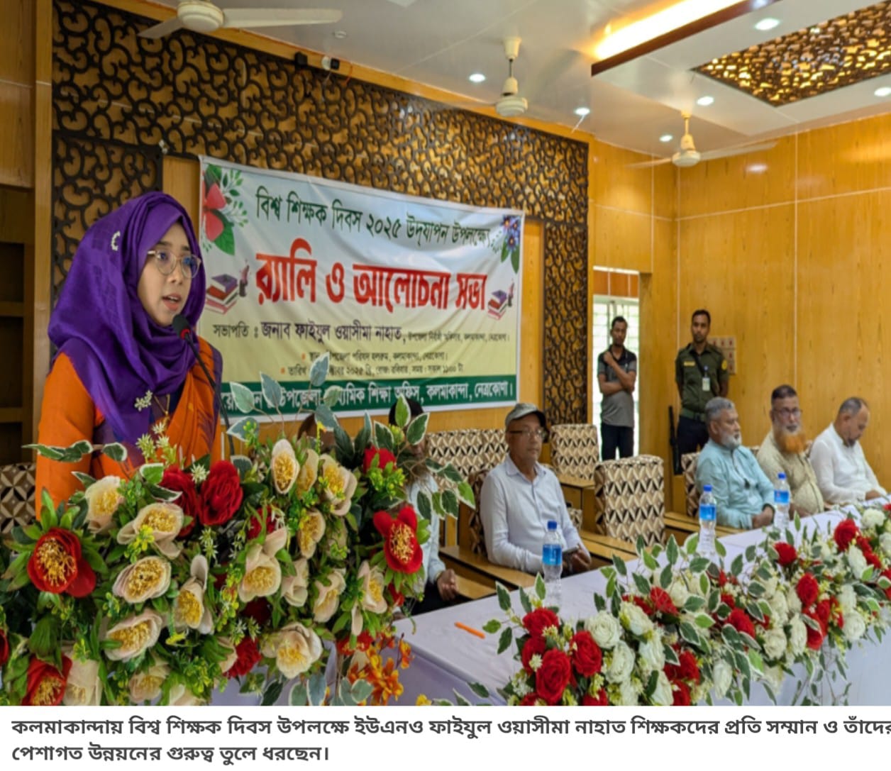 ‘শিক্ষকতা একটি মহান পেশা’—এই মূলমন্ত্রকে সামনে রেখে নেত্রকোনার কলমাকান্দা উপজেলায় যথাযোগ্য মর্যাদায় পালিত হয়েছে বিশ্ব শিক্ষক দিবস। উপজেলা মাধ্যমিক শিক্ষা কার্যালয়ের উদ্যোগে দিবসটি উপলক্ষে র্যালি ও আলোচনা সভার আয়োজন করা হয়।