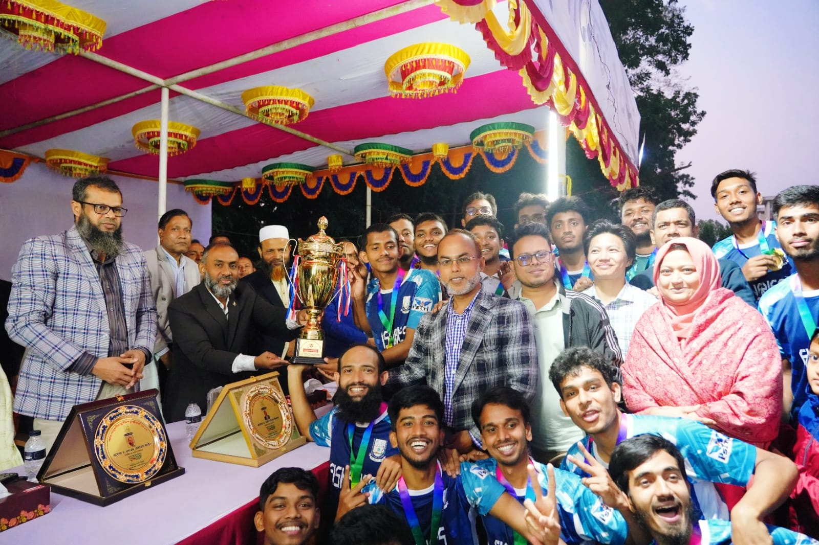 জেলা প্রতিনিধি পটুয়াখালীঃ পটুয়াখালী বিজ্ঞান ও প্রযুক্তি বিশ্ববিদ্যালয় আন্ত:অনুষদীয় ফুটবল টুর্নামেন্ট- ২০২৫ এর ফাইনাল খেলা ও পুরস্কার বিতরণী অনুষ্ঠান অদ্য বিকেল ৩ টায় বিশ্ববিদ্যালয় খেলার মাঠে অনুষ্ঠিত হয়। শারীরিক শিক্ষা বিভাগ কতৃক আয়োজিত এ অনুষ্ঠানে প্রধান অতিথি হিসেবে উপস্থিত ছিলেন ভাইস-চ্যান্সেলর প্রফেসর ড.কাজী রফিকুল ইসলাম। বিশেষ অতিথি হিসেবে উপস্থিত ছিলেন প্রো-ভাইস চ্যান্সেলর প্রফেসর ড.এস এম হেমায়েত জাহান,ট্রেজারার প্রফেসর ড. আব্দুল লতিফ ও রেজিস্ট্রার প্রফেসর ড.মো: ইকতিয়ার উদ্দিন । উক্ত খেলায় ফিশারিজ অনুষদ১-০ গোলে এএনএসভিএম অনুষদকে হারিয়ে চ্যাম্পিয়ন হওয়ার গৌরব অর্জন করে।পুরস্কার বিতরণপূর্বে শারীরিক শিক্ষা বিভাগের পরিচালক(অ.দা.)ড. আমিনুল ইসলাম টিটোর সঞ্চালনায় প্রধান অতিথির বক্তব্যে ভাইস-চ্যান্সেলর প্রফেসর ড. কাজী রফিকুল ইসলাম বলেন," বিশ্ববিদ্যালয় পর্যায়ে সহ- পাঠ্যক্রমিক কার্যক্রম শিক্ষার্থীদের শারীরিক ও মানসিক বিকাশে গুরুত্বপূর্ণ ভূমিকা রাখে। শৃংখলাবোধ,পারস্পরিক সহযোগিতা,নেতৃত্ব এসব গুণাবলী অর্জনে খেলাধুলা অপরিহার্য। পবিপ্রবি ক্যাম্পাসে খেলাধুলার পরিবেশ দিন দিন সমৃদ্ধ হচ্ছে। শিক্ষার্থীদের নিয়মিত খেলাধুলায় অংশগ্রহণ এবং সাফল্য আমাদের গর্বিত করেছে। এ বিশ্ববিদ্যালয়ের শিক্ষার্থীরা একাডেমিক উৎকর্ষের পাশাপাশি জাতীয় ও আন্তর্জাতিক অঙ্গনে ও ক্রীড়ায় এ বিশ্ববিদ্যালয়ের গৌরব বৃদ্ধি করুক এ কামনা করছি"।পরে তিনি চ্যাম্পিয়ন ও রানারআপ দলের হাতে ট্রফি তুলে দেন। এ সময় বিভিন্ন অনুষদের ডিন,চেয়ারম্যান, শিক্ষক,কর্মকর্তা, শিক্ষার্থী ও কর্মচারীরা উপস্থিত ছিলেন। উল্লেখ্য এ টুর্নামেন্টে বিশ্ববিদ্যালয়ের ৮ টি অনুষদ অংশগ্রহণ করেছে।দুই সপ্তাহব্যাপী এ আয়োজনে প্রতিদিনই অনুষ্ঠিত হয়েছে প্রতিযোগিতামূক ও উৎসাহপূর্ণ খেলা-যেখানে অংশগ্রহণকারীরা নিজেদের মেধা,মনোবল,প্রতিযোগিতা ও আনন্দঘন পরিবেশে অংশগ্রহণ করেন।অনুষ্ঠানে বিভিন্ন পর্যায়ের শিক্ষার্থী,শিক্ষক,কর্মকর্তা ও কর্মচারীদের উপস্থিতিতে অনুষ্ঠানটি এক আনন্দঘন মিলনমেলায় রুপ নেয়।