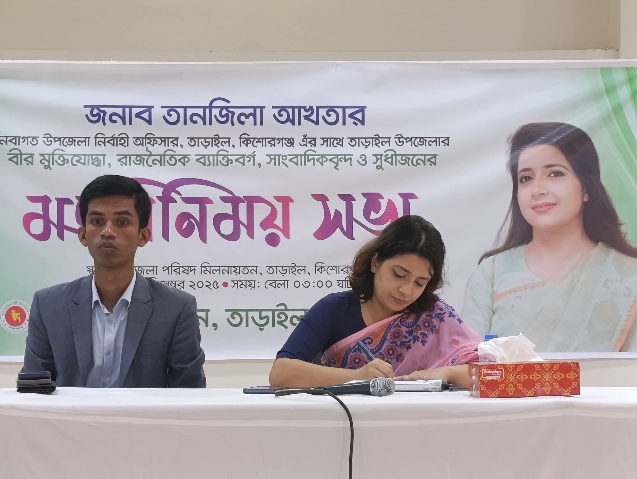 তাড়াইল উপজেলার নবাগত উপজেলা নির্বাহী অফিসার (ইউএনও) জনাব তানজিলা আখতার-এর সঙ্গে উপজেলার বীর মুক্তিযোদ্ধা, রাজনৈতিক ব্যক্তিবর্গ, সাংবাদিক এবং সুধীজনদের এক মতবিনিময় সভা অনুষ্ঠিত হয়েছে।