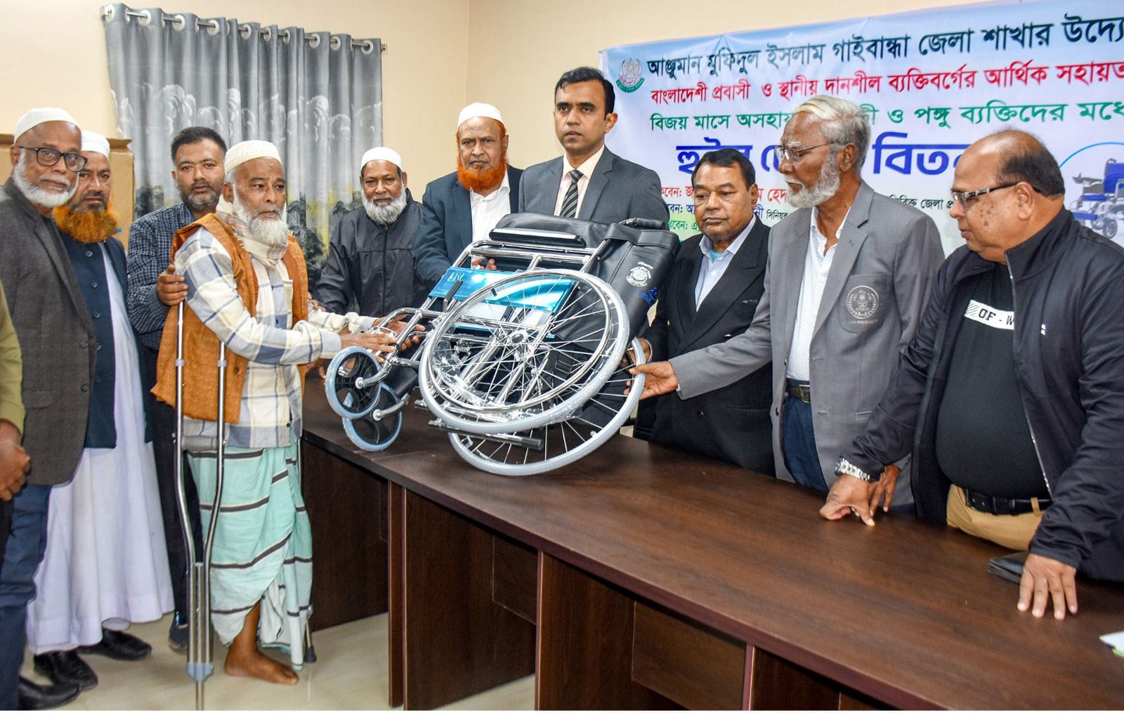 বিজয়ের মাস উপলক্ষে গাইবান্ধায় অসহায় প্রতিবন্ধী ও পঙ্গু ব্যক্তিদের মাঝে হুইলচেয়ার বিতরণ করেছে আঞ্জুমান মুফিদুল ইসলাম, গাইবান্ধা জেলা শাখা।