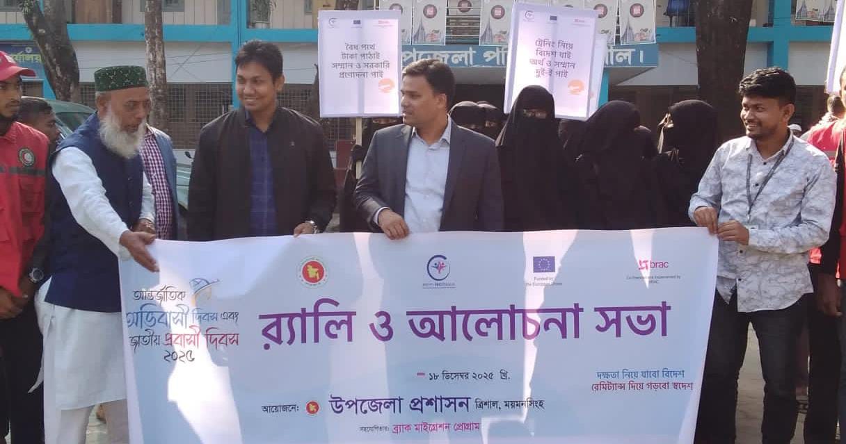 ময়মনসিংহের ত্রিশালে উপজেলা প্রশাসনের আয়োজনে ও ব্র্যাক মাইগ্রেশন প্রোগ্রামের সহযোগিতায় আন্তর্জাতিক অভিবাসী দিবস এবং জাতীয় প্রবাসী দিবস-২০২৫ উপলক্ষে র্যালি ও আলোচনা সভা অনুষ্ঠিত হয়েছে। এ লক্ষে গতকাল বৃহস্পতিবার সকাল সাড়ে ১০ টায় উপজেলা পরিষদ চত্বর থেকে এক বর্ণাঢ্য র্যালি শুরু হয়ে পৌর শহরের প্রধান প্রধান সড়ক প্রদক্ষিণ শেষে পুনরায় উপজেলা পরিষদ চত্বরে গিয়ে শেষ হয়। পরে সংক্ষিপ্ত আলোচনা সভায় বক্তব্য রাখেন উপজেলা নির্বাহী অফিসার আরাফাত সিদ্দিকী। এ সময় প্রবাস বন্ধু ফোরামের সভাপতি মোখলেছুর সবুজ, তথ্য ও প্রচার সম্পাদক সাংবাদিক ফারুক আহমেদ, আব্দুল্লাহ আল ফাহাদ, ব্র্যাক মাইগ্রেশন প্রোগ্রামের প্রোগ্রাম অর্গানাইজার ফিরোজ আহমেদ প্রমুখ উপস্থিত ছিলেন।