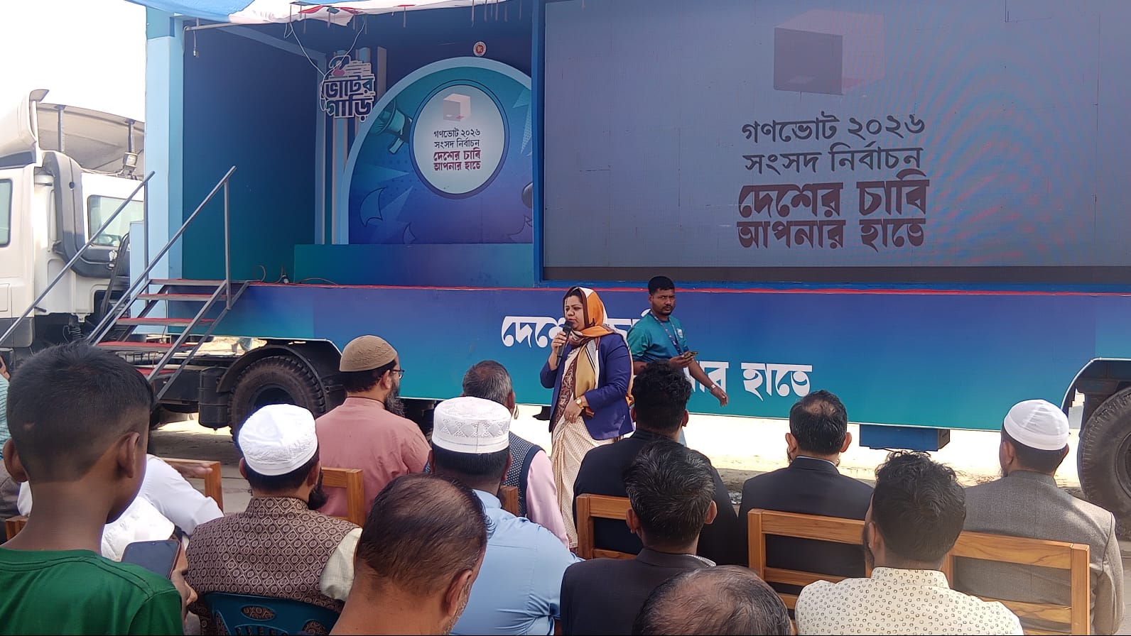 ত্রয়োদশ জাতীয় সংসদ নির্বাচন ও গণভোট বিষয়ে জনসচেতনতা বৃদ্ধির লক্ষ্যে করিমগঞ্জে ভ্রাম্যমাণ 'ভোটের গাড়ি’র মাধ্যমে প্রচারণা।