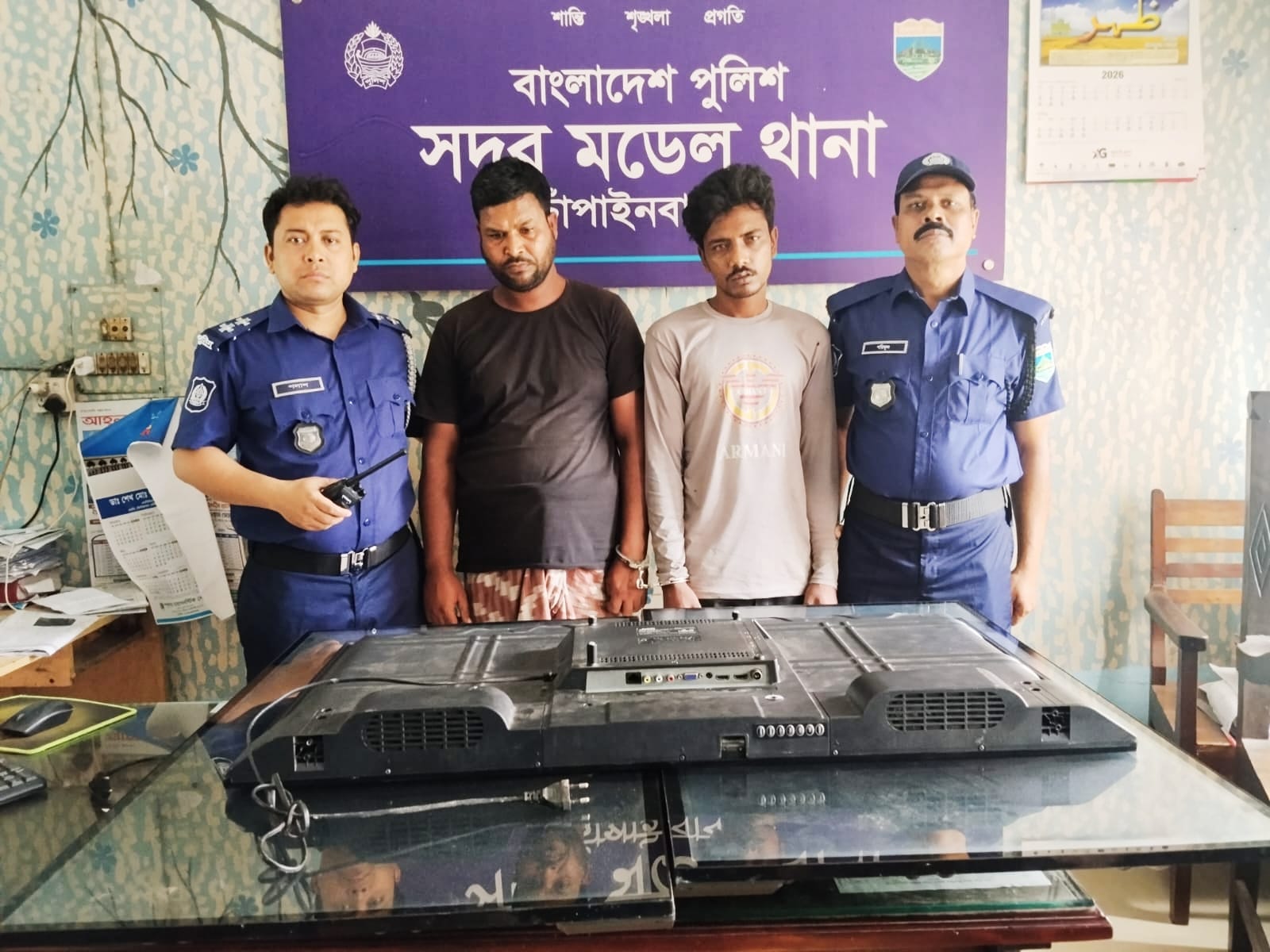 সোমবার রাতে বিষয়টি নিশ্চিত করেন চাঁপাইনবাবগঞ্জ সদর মডেল থানার পুলিশ পরিদর্শক (ওসি তদন্ত) সুকমল চন্দ্র দেবনাথ। তিনি জানান, পবিত্র ঈদুল ফিতর উপলক্ষে স্কুল বন্ধ থাকায় গত ১৭ মার্চ ২০২৬ তারিখে স্কুলের তৃতীয় তলার মাল্টিমিডিয়া ক্লাসরুমে অজ্ঞাতনামা চোরেরা চুরি সংঘটিত করে। এ সময় অফিস কক্ষের বিভিন্ন সরঞ্জাম ভাঙচুর করে প্রায় ৬০ হাজার টাকার ক্ষয়ক্ষতি করা হয়।চুরি হওয়া মালামালের মধ্যে ছিল ৩টি ৪০ ইঞ্চি স্মার্ট টিভি, একটি আইপিএস ব্যাটারি, একটি আইপিএস মেশিনসহ অন্যান্য ইলেকট্রনিক ডিভাইস। এ ঘটনায় স্কুলের প্রধান শিক্ষক মো. হাফিজউদ্দিন বাদী হয়ে সদর মডেল থানায় অজ্ঞাতনামা আসামিদের বিরুদ্ধে মামলা দায়ের করেন। মামলার তদন্তকারী কর্মকর্তা এসআই পলাশ অধিকারী ৩০ মার্চ রাতে শহরের বাতেন খাঁ মোড়ে অভিযান চালিয়ে আব্দুল্লাহ (২৯) নামে এক চোরকে গ্রেফতার করেন। পরে তার দেওয়া তথ্যের ভিত্তিতে শহরের আরামবাগ এলাকার রহিম আলীর বাড়ি থেকে চুরি হওয়া টেলিভিশনগুলো উদ্ধার করা হয়। চোরাই মালামাল কেনার অভিযোগে রহিম আলী (৪৫) কে গ্রেফতার করা হয়।