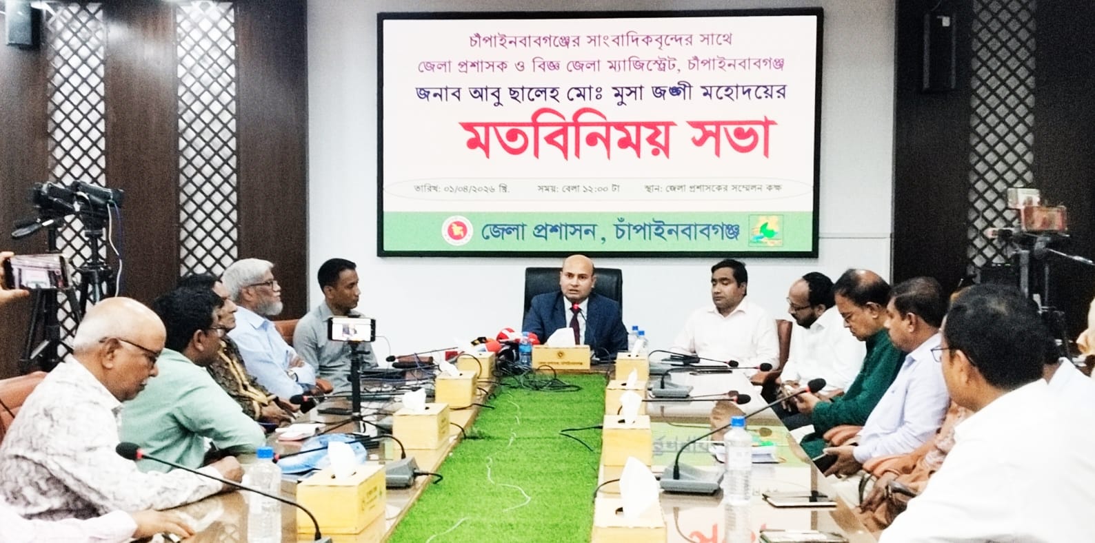 চাঁপাইনবাবগঞ্জের জেলা প্রশাসক ও বিজ্ঞ জেলা ম্যাজিস্ট্রেট আবু ছালেহ মোঃ মুসা জঙ্গী সাংবাদিকদের সঙ্গে এক মতবিনিময় সভা করেছেন। বুধবার (১ এপ্রিল) দুপুর ১২টায় জেলা প্রশাসনের আয়োজনে জেলা প্রশাসকের সম্মেলন কক্ষে এ সভা অনুষ্ঠিত হয়।