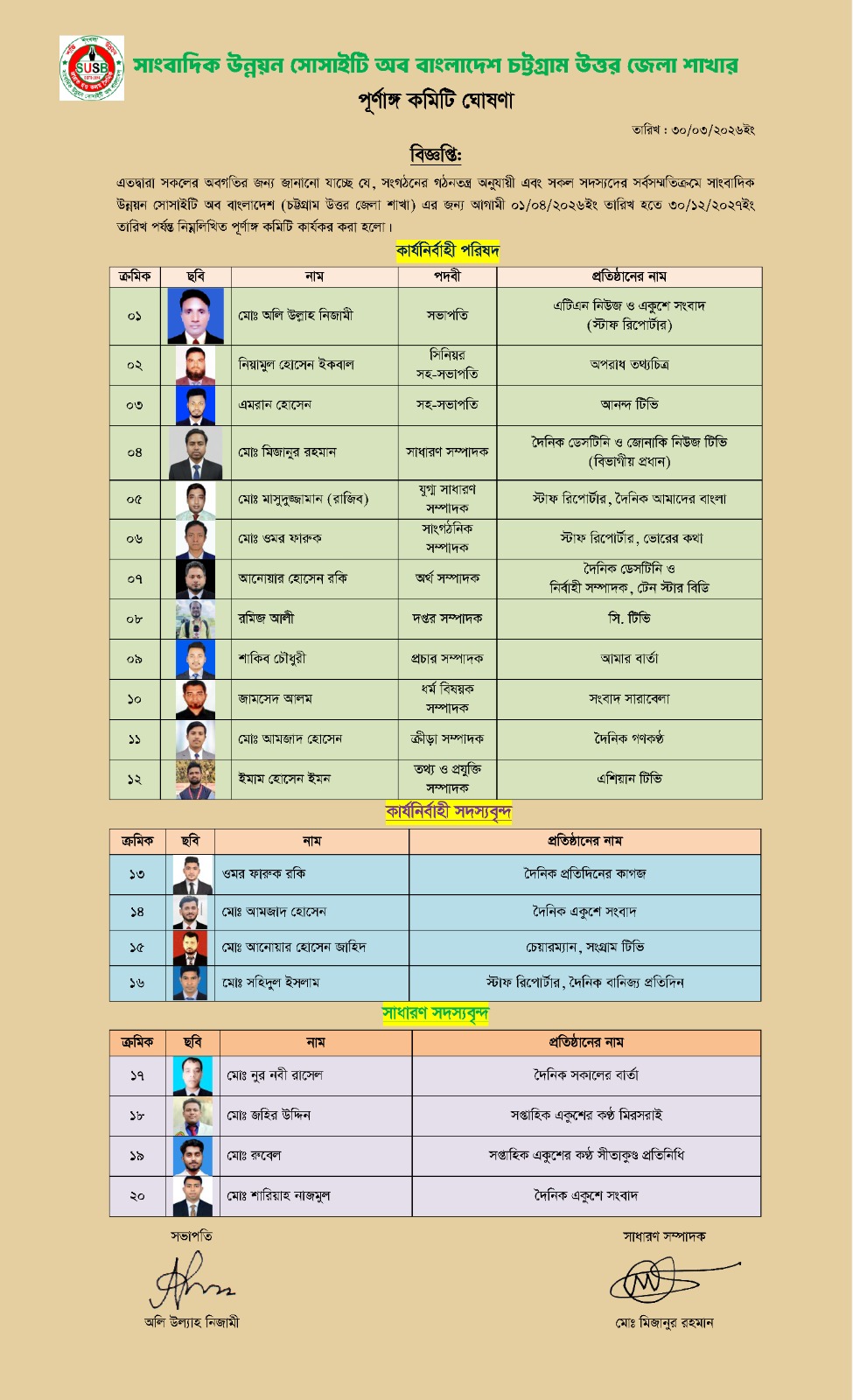 চট্টগ্রামের বস্তুনিষ্ঠ সাংবাদিকতার অগ্রযাত্রাকে বেগবান করতে একঝাঁক পেশাদার ও প্রতিশ্রুতিশীল সাংবাদিকদের নিয়ে গঠন করা হয়েছে 'সাংবাদিক উন্নয়ন সোসাইটি অব বাংলাদেশ' (SUSB), চট্টগ্রাম উত্তর জেলা শাখার পূর্ণাঙ্গ কার্যনির্বাহী কমিটি। দীর্ঘ জল্পনা-কল্পনার অবসান ঘটিয়ে, যোগ্য ও দক্ষ নেতৃত্ব নির্বাচনের লক্ষ্যে সর্বসম্মতিক্রমে এই ২০ সদস্য বিশিষ্ট পরিষদ ঘোষণা করা হয়।