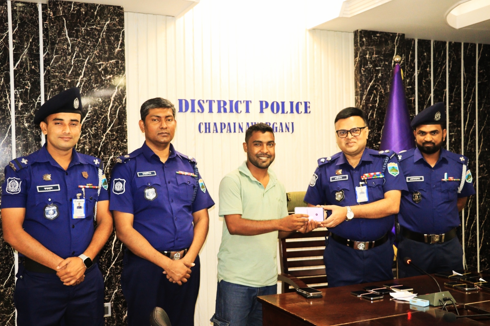 চাঁপাইনবাবগঞ্জ জেলার পুলিশ সুপারের কার্যালয়ের সম্মেলন কক্ষে সোমবার (০৬ এপ্রিল ) সকাল ১১ ঘটিকায় জিডি করা উদ্ধারকৃত মোবাইল ফোন মালিকদের নিকট হস্তান্তর করা হয়েছে। পুলিশ সূত্রে জানা যায়, মার্চ ২০২৬ মাসে জেলার বিভিন্ন থানায় দায়ের করা মোবাইল হারানোর সাধারণ ডায়েরি (জিডি) এর প্রেক্ষিতে অনলাইন মনিটরিংয়ের মাধ্যমে এসব মোবাইল ফোন উদ্ধার করা হয়। উদ্ধার কার্যক্রমে গুরুত্বপূর্ণ ভূমিকা পালন করেন সদর থানার এএসআই আব্দুল মোতালেব, যিনি ০৯টি মোবাইল ফোন উদ্ধার করেন। এছাড়া নাচোল থানার এএসআই মোঃ ফরহাদ হোসেন ০৩টি এবং ডিবি পুলিশের এসআই কামরুল হাসান ০২টি মোবাইল ফোন উদ্ধার করেন। সব মিলিয়ে মোট ১৪টি মোবাইল ফোন উদ্ধার করা হয়। পুলিশ সুপার কার্যালয়ে উদ্ধারকৃত মোবাইল ফোনগুলো মালিকদের কাছে হস্তান্তর করেন পুলিশ সুপার গৌতম কুমার বিশ্বাস। তিনি নিজ হাতে সেগুলো সংশ্লিষ্ট মালিকদের নিকট হস্তান্তর করেন। এসময় উপস্থিত ভুক্তভোগীরা তাদের হারানো মোবাইল ফিরে পেয়ে সন্তোষ প্রকাশ করেন এবং পুলিশের প্রতি কৃতজ্ঞতা জানান। পুলিশ সুপার গৌতম কুমার বিশ্বাস বলেন, প্রযুক্তির সহায়তায় হারানো মালামাল উদ্ধারে পুলিশের এ ধরনের কার্যক্রম অব্যাহত থাকবে।