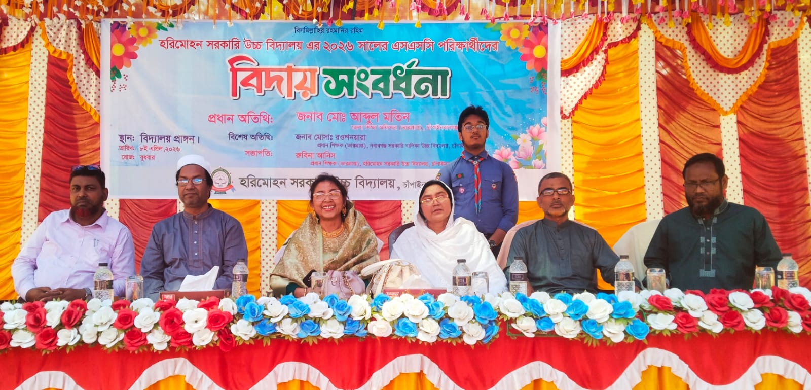 হরিমোহন সরকারি উচ্চ বিদ্যালয়ের ২০২৬ সালের এসএসসি পরীক্ষার্থীদের বিদায় সংবর্ধনা অনুষ্ঠান অনুষ্ঠিত হয়েছে। বুধবার (৮ এপ্রিল) সকাল ১০টায় বিদ্যালয়ের মাঠ প্রাঙ্গণে এ আয়োজন করা হয়। অনুষ্ঠানে সভাপতিত্ব করেন বিদ্যালয়ের প্রধান শিক্ষক (ভারপ্রাপ্ত) রুবিনা আনিস। শুরুতে কোরআন তেলাওয়াত করেন এসএসসি পরীক্ষার্থী তাসনিম হাসান এবং গীতা পাঠ করেন ৬ষ্ঠ শ্রেণির শিক্ষার্থী জিৎ মন্ডল। অনুষ্ঠানে স্বাগত বক্তব্য দেন সিনিয়র শিক্ষক মোঃ মনিরুজ্জামান। বিদায়ী শিক্ষার্থীদের উদ্দেশ্যে মানপত্র পাঠ করেন ৭ম শ্রেণির শিক্ষার্থী ইনতিসার কাওসার। এ সময় শিক্ষার্থীদের পক্ষে বক্তব্য দেন মাহামুদুল হাসান ফাহিম। অনুষ্ঠানে অতিথি হিসেবে উপস্থিত ছিলেন নবাবগঞ্জ সরকারি বালিকা উচ্চ বিদ্যালয়ের প্রধান শিক্ষক (ভারপ্রাপ্ত) মোসাঃ রওশনআরা, দায়িত্বপ্রাপ্ত সহকারী প্রধান শিক্ষক (প্রভাতি শাখা) মোহাঃ আব্দুল বাশির, সহকারী শিক্ষক মোঃ আজমাল হোসেন, সিনিয়র শিক্ষক সৈয়দ মফিজুল ইসলাম, সিনিয়র শিক্ষক মোঃ মাহবুবুল হক মিঠু ও মোঃ নাসিরুদ্দিনসহ অন্যান্য শিক্ষকবৃন্দ। অনুষ্ঠানের শেষ পর্বে বিদায়ী শিক্ষার্থীদের সার্বিক সাফল্য কামনা করে দোয়া অনুষ্ঠিত হয়।