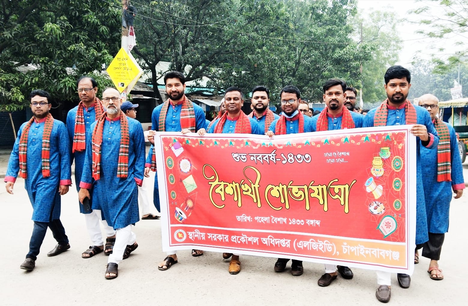বাংলা নববর্ষ ১৪৩৩ উদযাপন উপলক্ষে চাঁপাইনবাবগঞ্জে স্থানীয় সরকার প্রকৌশল অধিদপ্তর (এলজিইডি)’র উদ্যোগে বর্ণাঢ্য বৈশাখী শোভাযাত্রা ও আপ্যায়ন কর্মসূচি অনুষ্ঠিত হয়েছে। মঙ্গলবার (১৪ এপ্রিল) সকাল ১০টায় এলজিইডি জেলা কার্যালয় থেকে শোভাযাত্রাটি বের হয়ে শহরের প্রধান প্রধান সড়ক প্রদক্ষিণ করে। শোভাযাত্রায় অংশগ্রহণকারী কর্মকর্তা-কর্মচারীরা রঙিন পোশাক, ফেস্টুন ও বৈশাখী সাজে উৎসবমুখর পরিবেশ সৃষ্টি করেন। অনুষ্ঠানে সভাপতিত্ব করেন এলজিইডি চাঁপাইনবাবগঞ্জের নির্বাহী প্রকৌশলী মোঃ আনোয়ার হোসেন। এ সময় উপস্থিত ছিলেন সিনিয়র সহকারী প্রকৌশলী মোঃ শাহিনুজ্জামান, সহকারী প্রকৌশলী মোঃ শাওন ইসলাম, সহকারী প্রকৌশলী মোঃ আরিফুল ইসলাম এবং উপ-সহকারী প্রকৌশলী মোঃ ইমতিয়াজ হোসেনসহ অন্যান্য কর্মকর্তারা। প্রধান বক্তা হিসেবে বক্তব্যে দেন, মোঃ আনোয়ার হোসেন। তিনি বলেন, বাংলা নববর্ষের ঐতিহ্য, সংস্কৃতি ও বাঙালির অসাম্প্রদায়িক চেতনার গুরুত্ব তুলে ধরেন। তিনি আরোও বলেন, এ ধরনের আয়োজন নতুন প্রজন্মের কাছে বাঙালির সংস্কৃতি পৌঁছে দিতে গুরুত্বপূর্ণ ভূমিকা রাখে। শোভাযাত্রা শেষে অংশগ্রহণকারীদের জন্য আপ্যায়নের ব্যবস্থা করা হয়, যা অনুষ্ঠানে ভিন্নমাত্রা যোগ করে।
