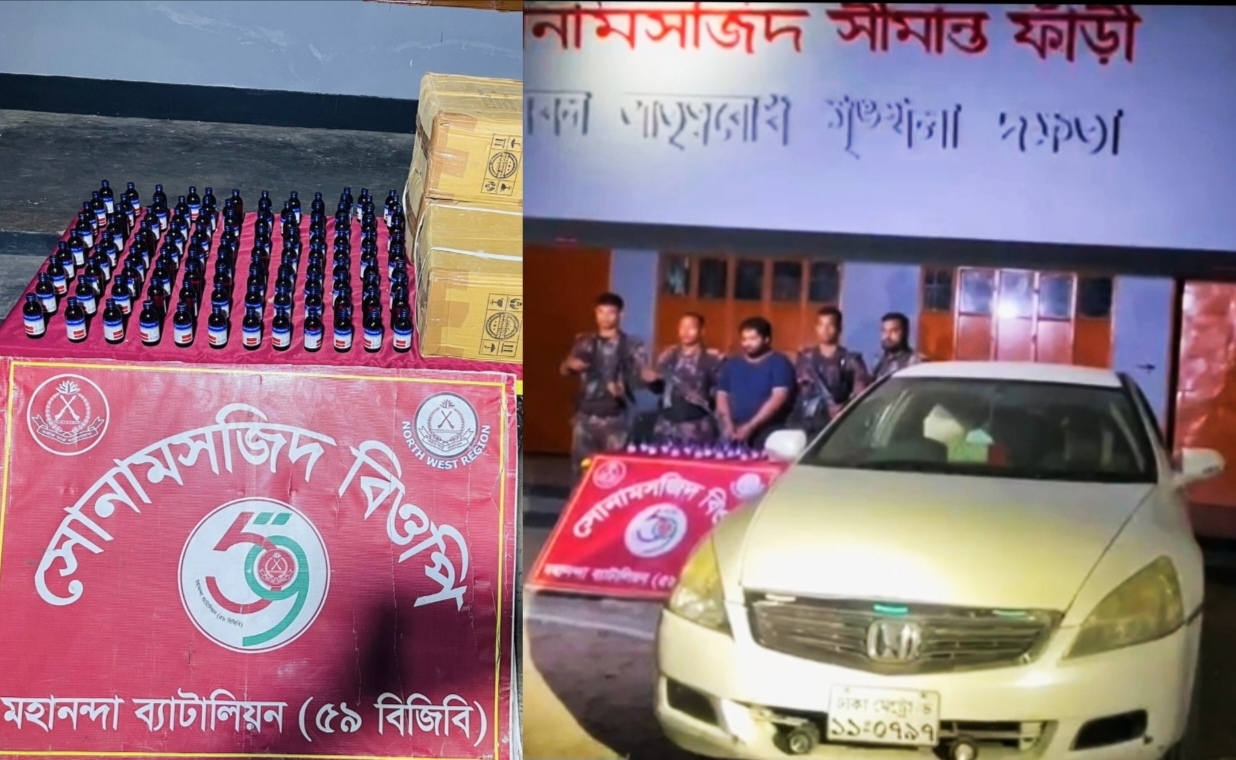 চাঁপাইনবাবগঞ্জের শিবগঞ্জ উপজেলার সোনামসজিদ সীমান্ত এলাকায় পৃথক দুটি অভিযানে বিপুল পরিমাণ নেশাজাতীয় সিরাপসহ এক ব্যক্তিকে আটক করেছে মহানন্দা ব্যাটালিয়ন (৫৯ বিজিবি)। এসময় একটি প্রাইভেট কারও জব্দ করা হয়। বিজিবি সূত্রে জানা যায়, সীমান্ত এলাকায় চোরাচালান ও মাদকবিরোধী চলমান অভিযানের অংশ হিসেবে গোপন সংবাদের ভিত্তিতে (১৪ এপ্রিল) তারিখ রাতের প্রথম প্রহরে দুটি অভিযান পরিচালনা করা হয়। প্রথম অভিযানে সোনামসজিদ বিওপি’র একটি টহলদল সীমান্ত পিলার ১৮৫/২-এস থেকে প্রায় ৯০০ গজ বাংলাদেশের অভ্যন্তরে শাহাবাজপুর ইউনিয়নের পিরোজপুর গ্রামে কৌশলগত অবস্থান নেয়। এসময় একটি প্রাইভেট কার (অ্যাকর্ড, ২৩৫০ সিসি) থামিয়ে তল্লাশি চালিয়ে ২৮ বোতল ভারতীয় নেশাজাতীয় ইসক্যাপ ডিএক্স সিরাপসহ আব্দুল্লাহ আল-আরাফাত শুভ (২৬) নামে এক ব্যক্তিকে আটক করা হয়। তিনি নওগাঁ জেলার মান্দা উপজেলার প্রসাদপুর এলাকার বাসিন্দা। অপরদিকে, একই রাতে আরেকটি টহলদল সীমান্ত পিলার ১৮৫/১৫-এস থেকে প্রায় ৪০ গজ বাংলাদেশের অভ্যন্তরে শাহাবাজপুর ইউনিয়নের বালিয়াদিঘী গ্রামে গণকবর সংলগ্ন এলাকায় অভিযান চালায়। এসময় মালিকবিহীন অবস্থায় ৫৪৯ বোতল ভারতীয় নেশাজাতীয় ইসক্যাপ ডিএক্স সিরাপ জব্দ করা হয়। বিজিবির উপস্থিতি টের পেয়ে সংঘবদ্ধ মাদক চক্রটি পালিয়ে যায়। আটককৃত আসামী, জব্দকৃত মাদকদ্রব্য ও প্রাইভেট কারের বিষয়ে আইনগত প্রক্রিয়া চলমান রয়েছে বলে জানানো হয়েছে।
