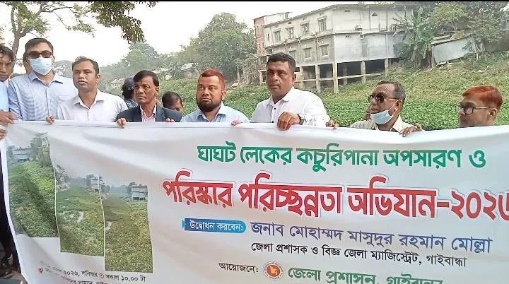 মশাবাহিত ডেঙ্গুর বিস্তার প্রতিরোধে গাইবান্ধার পৌরসভার ঘাঘট লেকে সপ্তাহব্যাপী কঁচুরিপানা অপসারণ ও পরিস্কার পরিচ্ছন্নতা অভিযানের শুভ উদ্বোধন করা হয়েছে। আজ শনিবার বেলা ১১ টার দিকে জেলা প্রশাসনের আয়োজনে ও গাইবান্ধা পৌরসভার সহযোগিতায় গাইবান্ধা সদর ভুমি অফিসের সামনে ঘাঘট লেকের ভাসমান কঁচুরিপানা অপসারন ও পরিস্কার পরিচ্ছন্নতা অভিযানের উদ্বোধন করা হয়।