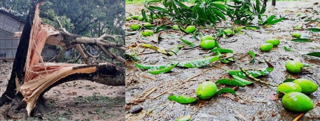 চাঁপাইনবাবগঞ্জে কালবৈশাখী ঝড়ে ৪ হাজার ৯০০ হেক্টর জমির আম বাগান ক্ষতিগ্রস্ত হয়েছে। শনিবার দিবাগত রাতে জেলার পাঁচটি উপজেলার উপর দিয়েই বয়ে যাওয়া ঝড়ে এ ক্ষয়ক্ষতি হয়। এছাড়াও ক্ষতিগ্রস্ত হয়েছে অন্যান্যা ফলসহ বিভিন্ন ফসলের। রোববার দুপুরে জেলা কৃষি সম্প্রসারণ অধিদপ্তর থেকে এ তথ্য জানানো হয়েছে। স্থানীয়রা জানান, শনিবার দিবাগত রাত সোয়া ১২ দিকে ঝড় বৃষ্টি শুরু হয়। বিভিন্নস্থানে প্রায় আধা ঘণ্টা স্থায়ী হয় কালবৈশাখী ঝড়। ঝড়ে সবচেয়ে বেশি ক্ষতিগ্রস্ত হয়েছে আম বাগান। বিপুল পরিমাণ আম ঝরে গেছে। পাশাপাশি বিভিন্ন এলাকায় গাছের ডাল ভেঙ্গে পড়েছে। এমনকি কোথাও কোথাও পুরো গাছ উপড়ে গেছে। এছাড়াও লিচুসহ অন্যান্য ফসলের ক্ষতি হয়েছে। জেলা কৃষি সম্প্রসারণ অধিদপ্তরের উপ-পরিচালক ইয়াছিন আলী বলেন, জেলার পাঁচ উপজেলায় গড় বৃষ্টিপাত ১৭ দশমিক ৪ মিলিমিটার। সবচেয়ে বেশি বৃষ্টিপাত হয়েছে সদর উপজেলায়, ২০ মিলিমিটার। ৫ উপজেলাতেও ঝড় হলেও আমের ক্ষতি হয়েছে শুধু শিবগঞ্জ উপজেলায়। এ উপজেলার ৪ হাজার ৯০০ হেক্টর জমির আম বাগান ঝড়ে আক্রান্ত হয়েছে। এছাড়াও কালবৈশাখী ঝড়ে কলা, ভুট্টা, বোরোধানসহ অন্যান্য ফসলের ক্ষতি হয়েছে। এদিকে ঝড়ের কারণে জেলার বিভিন্ন এলাকায় ৮ থেকে ১১ ঘণ্টা পর্যন্ত বিদ্যুৎ সরবরাহ বন্ধ ছিলো।