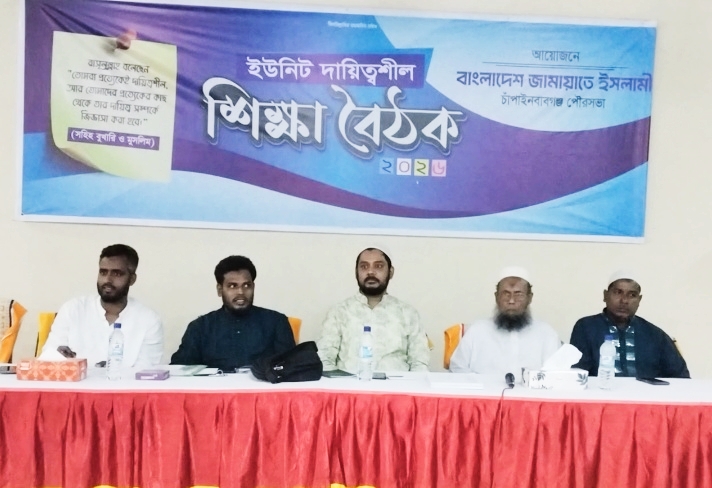 বাংলাদেশ জামায়াতে ইসলামী-এর চাঁপাইনবাবগঞ্জ পৌরসভার উদ্যোগে ইউনিট দায়িত্বশীল শিক্ষা বৈঠক-২০২৬ অনুষ্ঠিত হয়েছে। শনিবার (২৫ এপ্রিল) বিকাল ৪টা ৩০ মিনিটে চাঁপাইনবাবগঞ্জ টাউন ক্লাব মিলনায়তনে এ বৈঠক অনুষ্ঠিত হয়। অনুষ্ঠানের শুরুতে কোরআন তেলাওয়াত, উপস্থিতি পর্যালোচনা এবং উদ্বোধনী বক্তব্য প্রদান করেন জেলা মজলিশে শূরা সদস্য ও নায়েবে আমীর অ্যাডভোকেট শফিক এনাতুল্লাহ। দারসুল কুরআন পেশ করেন জেলা সহকারী সেক্রেটারি অধ্যাপক মো. আমানুল্লাহ। ইউনিট পর্যায়ে সাংগঠনিক কার্যক্রম বাস্তবায়ন নিয়ে আলোচনা করেন জেলা আমীর মাওলানা আবুজার গিফারী। ব্যক্তিগত মানউন্নয়ন ও শপথের গুরুত্ব বিষয়ে বক্তব্য দেন জেলা সেক্রেটারি অধ্যাপক আবু বক্কর। ব্যবহারিক জীবন নিয়ে দিকনির্দেশনা দেন কেন্দ্রীয় কর্মপরিষদের সদস্য ও সাবেক মেয়র অধ্যক্ষ মোহাম্মদ নজরুল ইসলাম। বর্তমান প্রেক্ষাপটে ইউনিটের পরিকল্পনা গ্রহণ ও বাস্তবায়ন পদ্ধতি নিয়ে আলোচনা করেন কেন্দ্রীয় সাংগঠনিক সম্পাদক ও রাজশাহী অঞ্চলের সহকারী জোন পরিচালক অধ্যাপক রফিকুল ইসলাম। জনসম্পৃক্ততায় ইউনিট দায়িত্বশীলদের ভূমিকা বিষয়ে বক্তব্য দেন কেন্দ্রীয় মজলিশে শূরা সদস্য ও সাবেক উপজেলা চেয়ারম্যান মো. মোখলেশুর রহমান। সভায় সমাপনী বক্তব্য দেন চাঁপাইনবাবগঞ্জ পৌর জেলা কর্মপরিষদ সদস্য ও আমীর হাফেজ গোলাম রাব্বানী। অনুষ্ঠানে বিভিন্ন শিল্পীগোষ্ঠী ইসলামি সংগীত পরিবেশন করে। শেষে অংশগ্রহণকারীদের জন্য রাতের খাবারের ব্যবস্থা রাখা হয়।