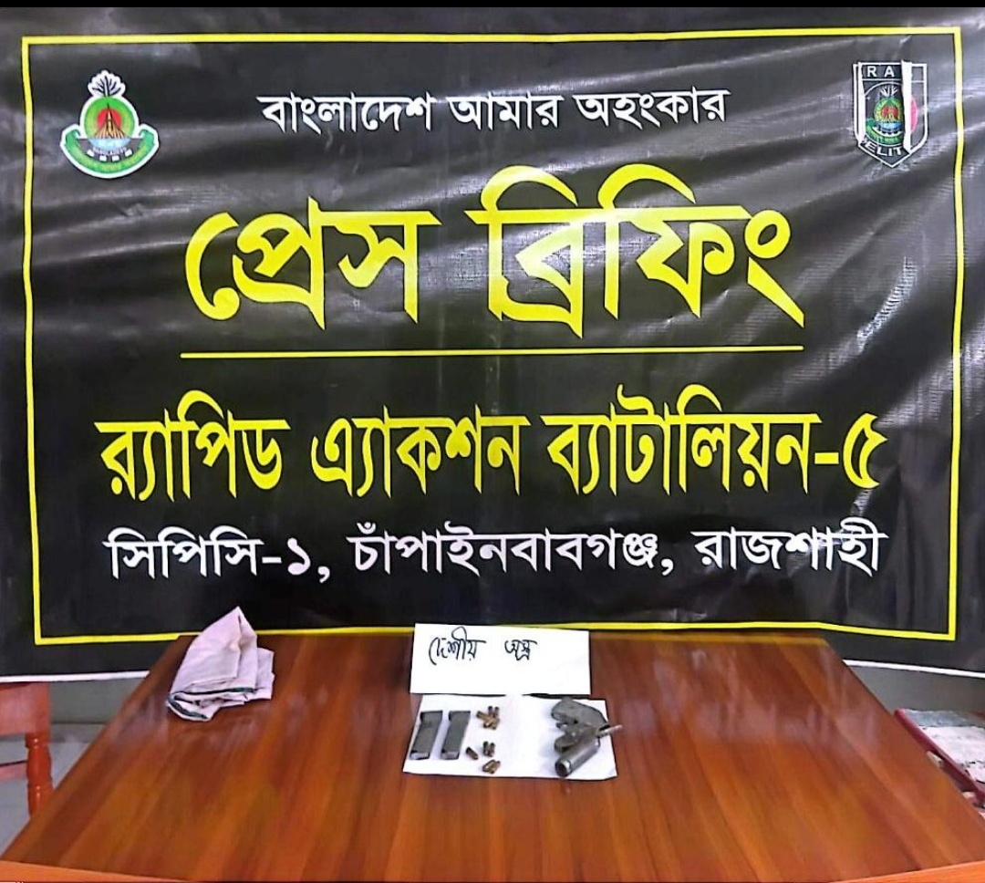 চাঁপাইনবাবগঞ্জের শিবগঞ্জ থানাধীন মনাকষা ইউনিয়নের পারচৌকা এলাকায় অভিযান চালিয়ে একটি বিদেশি পিস্তল, ম্যাগাজিন ও ১০ রাউন্ড গুলিসহ একজনকে আটক করেছে র্যাব-৫ এর একটি আভিযানিক দল। র্যাব জানায়, গোপন সংবাদের ভিত্তিতে গত (২৯ এপ্রিল) তারিখ বিকেল ৫:৪০ মিনিটে র্যাব-৫, সিপিসি-১ এর একটি দল এই বিশেষ অভিযান পরিচালনা করে। অভিযান চলাকালীন পারচৌকা দক্ষিণপাড়া গ্রামের জনৈক ব্যক্তির আমবাগানে সন্দেহভাজন এক ব্যক্তির দেহ তল্লাশি করে তার নিকট থেকে ৮ ইঞ্চি লম্বা একটি দেশীয় তৈরি বিদেশি পিস্তল, ২টি ম্যাগাজিন এবং ১০ রাউন্ড গুলি উদ্ধার করা হয়। র্যাব সূত্রে আরও জানা গেছে, আটককৃত ব্যক্তি দীর্ঘদিন যাবৎ অবৈধ অস্ত্র ব্যবসার সাথে জড়িত ছিলেন বলে প্রাথমিক জিজ্ঞাসাবাদে স্বীকার করেছেন। উদ্ধারকৃত আলামতসহ আটক ব্যক্তিকে শিবগঞ্জ থানায় হস্তান্তর করা হয়েছে এবং তার বিরুদ্ধে অস্ত্র আইনে মামলা দায়েরের প্রক্রিয়া চলমান রয়েছে। জননিরাপত্তা নিশ্চিত করতে র্যাবের এই ধরনের অস্ত্রবিরোধী অভিযান অব্যাহত থাকবে বলে বাহিনীর পক্ষ থেকে জানানো হয়েছে।