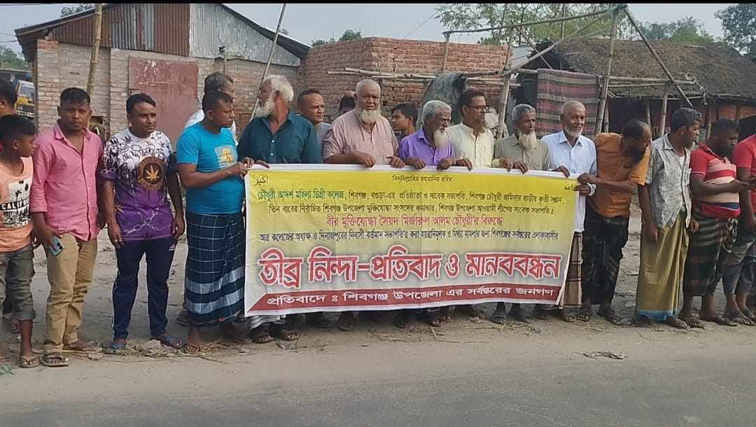 গতকাল শনিবার দুপুর ২টায় উপজেলার শিবগঞ্জ হাট এলাকায় ঐ কলেজের সামনে শিবগঞ্জ উপজেলার সর্বস্তরের জনগণের ব্যানারে এ মানববন্ধন কর্মসূচি পালিত হয়।
