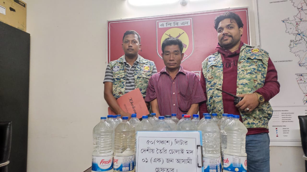 শনিবার ২৫ নভেম্বর সন্ধ্যার দিকে বান্দরবান সদর থানাধীন ৪ নং সুয়ালক ইউনিয়নের বিশ্ববিদ্যালয়ের তিন রাস্তার মোড়ের সামনে বান্দরবান কেরানিহাট সড়কের পাকা রাস্তার উপর বান্দরবান ২ এপিবিএন টহল ডিউটি পরিচালনা করার সময় গোপন সংবাদের মাধ্যমে কেরানিহাট গামী একটি মহেন্দ্র তল্লাশি করে ৫০ লিটার চোলাই মদ ও মাহিন্দ্রা সহ একজন আসামি আটক করেন।