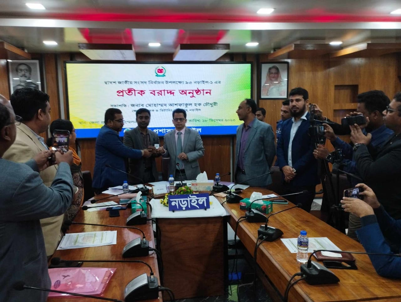 দ্বাদশ জাতীয় সংসদ নির্বাচনে নড়াইলের দুটি সংসদীয় আসনে ১২ এমপি প্রার্থীর প্রতীক বরাদ্দ সম্পন্ন হয়েছে।গত সোমবার ১৮-১২-২০২৩ ইং বেলা ১২টায় জেলা প্রশাসকের সম্মেলন কক্ষে প্রার্থী এবং প্রার্থীর প্রতিনিধির কাছে নির্বাচনী প্রতীক হস্তান্তর করেন জেলা রিটার্নিং অফিসার ও জেলা প্রশাসক মোহাম্মদ আশফাকুল হক চৌধুরী।এ সময় সহকারি রিটার্নিং অফিসার ও অতিরিক্ত জেলা ম্যাজিষ্ট্রেট লিংকন বিশ্বাস,জেলা নির্বাচন কর্মকর্তা মোঃ জসিম উদ্দিন,সদর উপজেলা নির্বাহী কর্মকর্তা শারমিন আক্তার উপস্থিত ছিলেন।