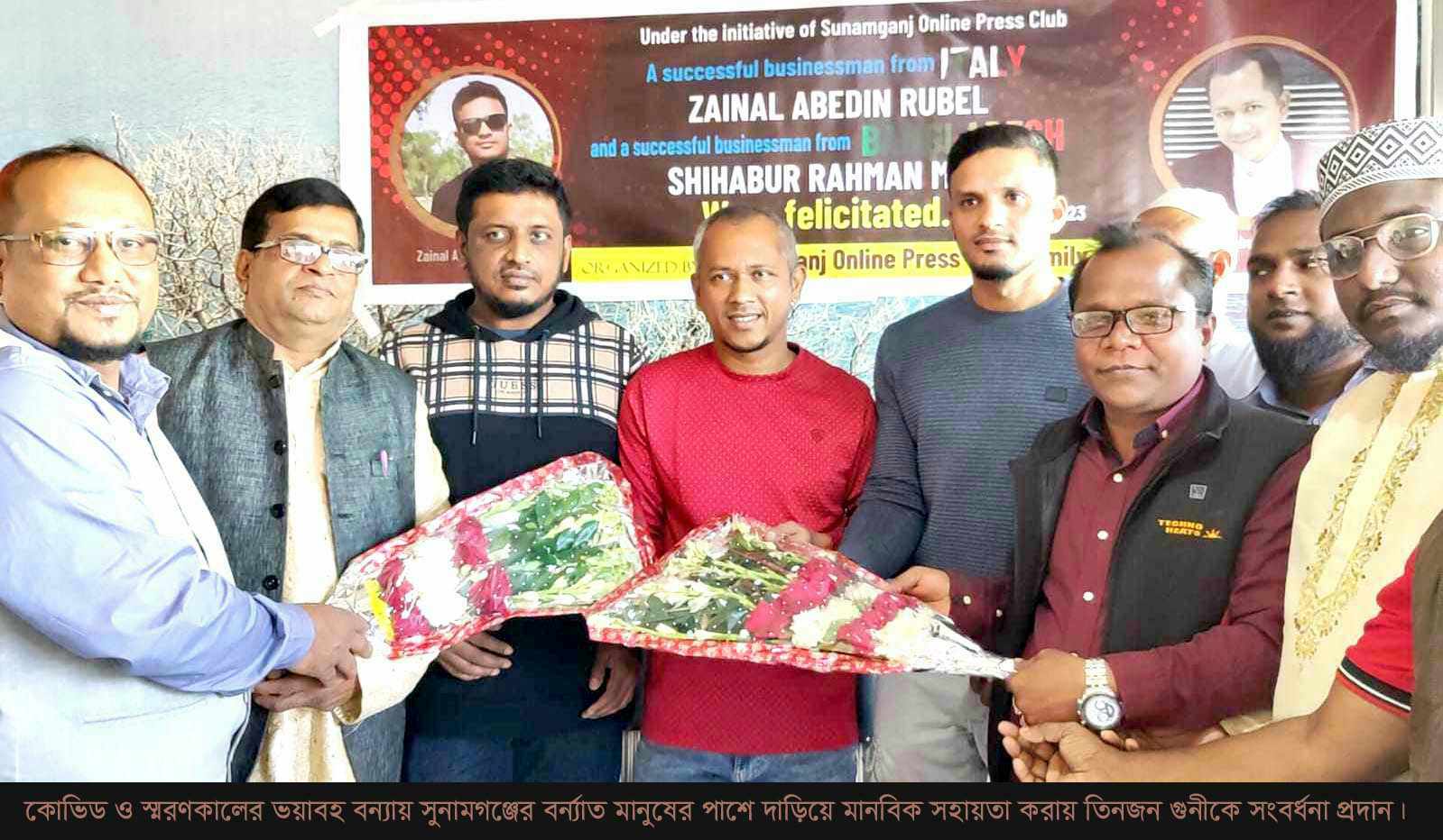 গত কোভিড-১৯ ও সুনামগঞ্জে ২০২২ সালের স্মরণকালের ভয়াবহ বন্যার সময় ব্রাহ্মণবাড়িয়া জেলার ইটালী প্রবাসী জয়নাল আবেদীন রুবেল,গাজীপুরের ইটালী প্রবাসী আবু ইয়াসিন ও গোপালগঞ্জের সন্তান ও ঢাকার বিশিষ্ঠ ব্যবসায়ী শিহাবুর রহমান মানিক কর্তৃক বন্যার্ত হাজারো মানুষের পাশে দাড়িঁয়ে তাদের ত্রান ও অর্থনৈতিক মানবিক সহায়তা প্রদান করায় এই তিনজন গুনী ব্যাক্তিকে সংবর্ধনা ও সম্মাননা ক্রেষ্ট প্রদান করা হয়েছে।