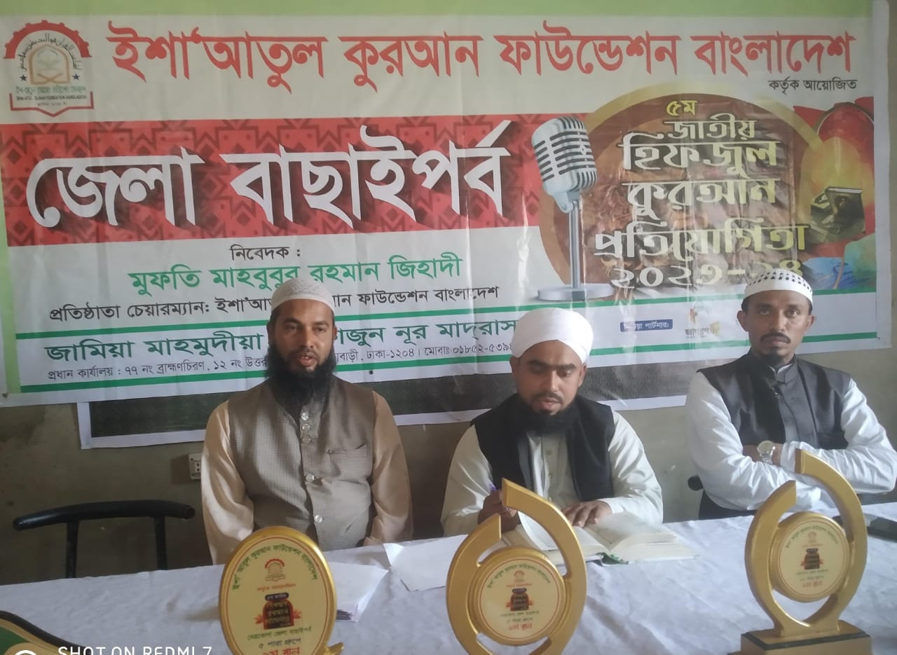 এসময় প্রধান বিচারক হিসেবে উপস্থিত ছিলেন, মুফতি মাহবুবুর রহমান জিহাদী। প্রতিষ্ঠাতা চেয়ারম্যান. ইশাআতুল কুরআন ফাউন্ডেশন বাংলাদেশ, এবং হাফেজ মাওলানা সানাউল্লাহ সায়িম সাহেব। এছাড়া ও বিভিন্ন শিক্ষা প্রতিষ্ঠানের উস্তাদগন এবং এলাকার মুরব্বিগন উপস্থিত ছিলেন। বিচক্ষণতার সাথে বিচার কার্যক্রম করে দুই গ্রুপে ৭+৭ মোট ১৪ জনকে ক্রেষ্ট, সনদ ও ইয়েস কার্ড প্রধান করা হলো। এসাড়াও দুই গ্রুপে আরো ২৬ জনকে ইয়েস কার্ড প্রধান করা হয় অর্থাৎ মোট ৪০ জন ফাইনালে ঢাকা যাওয়ার অনুমতি পান । উক্ত ফাউন্ডেশনের ফাইনাল রাউন্ড অনুষ্ঠিত হবে ২০২৪সালের ১০শে ফেব্রুয়ারী রোজ শনিবার, স্থান : জাতীয় মসজিদ বায়েতুল মোকাররম ইসলামিক ফাউন্ডেশন মিলনায়তনে। জানা সুত্রে সংগঠনটি বাংলাদেশের শীর্ষ স্তরের ওলামায়ে কেরাম ও হুফ্ফাজে কেরামদের তত্ত্বাবধানে দুর্নীতি ও ভেজালমুক্ত ভাবে কুরআনের কাজ চালিয়ে যাচ্ছে সাড়া বাংলাদেশে।