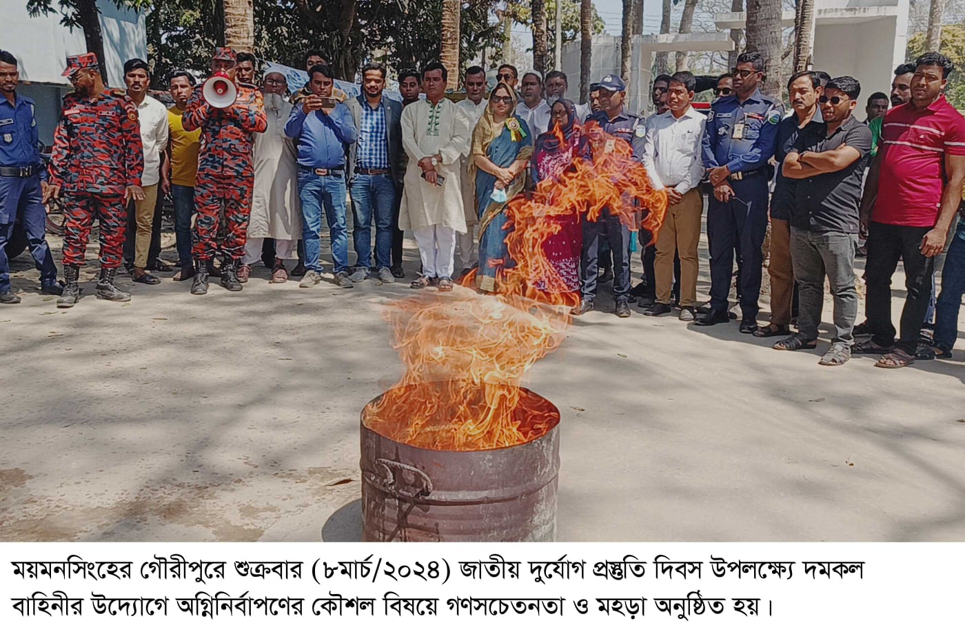 ময়মনসিংহের গৌরীপুরে রোববার (১০মার্চ/২০২৪) জাতীয় দুর্যোগ প্রস্তুতি দিবস উপলক্ষ্যে উপজেলা প্রশাসনের উদ্যোগে ‘দুযোগ প্রস্তÍুতিতে লড়বো, স্মার্ট সোনার বাংলা গড়বো’ প্রতিপাদ্য বিষয়ে বর্ণাঢ্য শোভাযাত্রা শহর প্রদক্ষিণ করে। শোভাযাত্রা শেষে গৌরীপুর দমকল বাহিনীর উদ্যোগে অগ্নিনির্বাপণের কৌশল বিষয়ে গণসচেতনতা ও মহড়া অনুষ্ঠিত হয়।