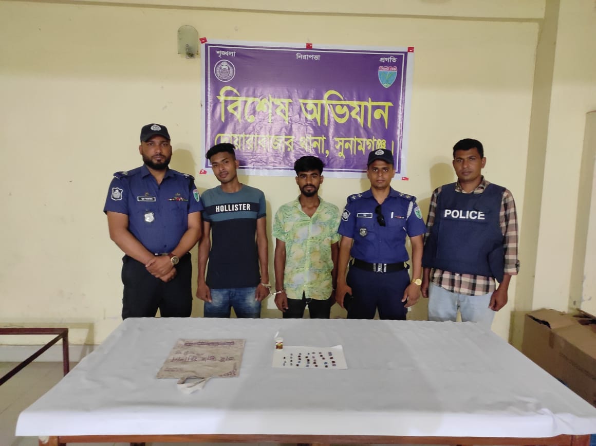 পুলিশ সুত্রে যানাযায়, গোপন সংবাদের ভিত্তিতে বুধবার (২৪ এপ্রিল) বিকালে উপজেলার বাংলাবাজার ইউনিয়নের বাংলাবাজার তানহা রেস্টুরেন্ট এর বিপরীত থেকে এস আই এনামুল হক মিঠু ও এ এস আই নোমান মিয়ার নেতৃত্বে সঙ্গীয় ফোর্সের সহযোগিতায় শিশু আবু বকর হত্যা মামলার পরোয়ানাভুক্ত প্রধান আসামি উপজেলার বাংলাবাজার ইউনিয়নের উরুরগাও গ্রামের আব্দুস ছামাদের পুত্র ডালিম মিয়া(২৭) ও দোয়ারাবাজার ইউনিয়নের নৈনগাঁও গ্রামের আরমান আলীর পুত্র মিনার(২৮)এর দেহ তল্লাশি করে তাদের হেফাজতে থাকা ৯০ পিছ এমফিটামিন সমৃদ্ধ মাদক ইয়াবা ট্যাবলেটসহ তাদের আটক করেন।