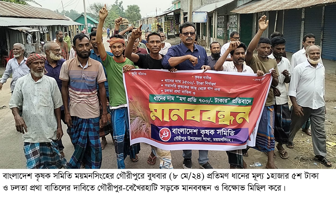 বাংলাদেশ কৃষক সমিতি ময়মনসিংহের গৌরীপুর উপজেলা শাখার উদ্যোগে বুধবার (৮ মে/২৪) প্রতিমণ ধানের মূল্য ১হাজার ৫শ টাকা, সরাসরি কৃষকের নিকট থেকে ধান ক্রয় ও ঢলতা প্রথা বাতিলের দাবিতে গৌরীপুর-বেখৈরহাটি সড়কের বীরআহাম্মদপুর ফকিরবাড়ির মোড় এলাকায় মানববন্ধন, বিক্ষোভ মিছিল ও কৃষক সমাবেশ করে।