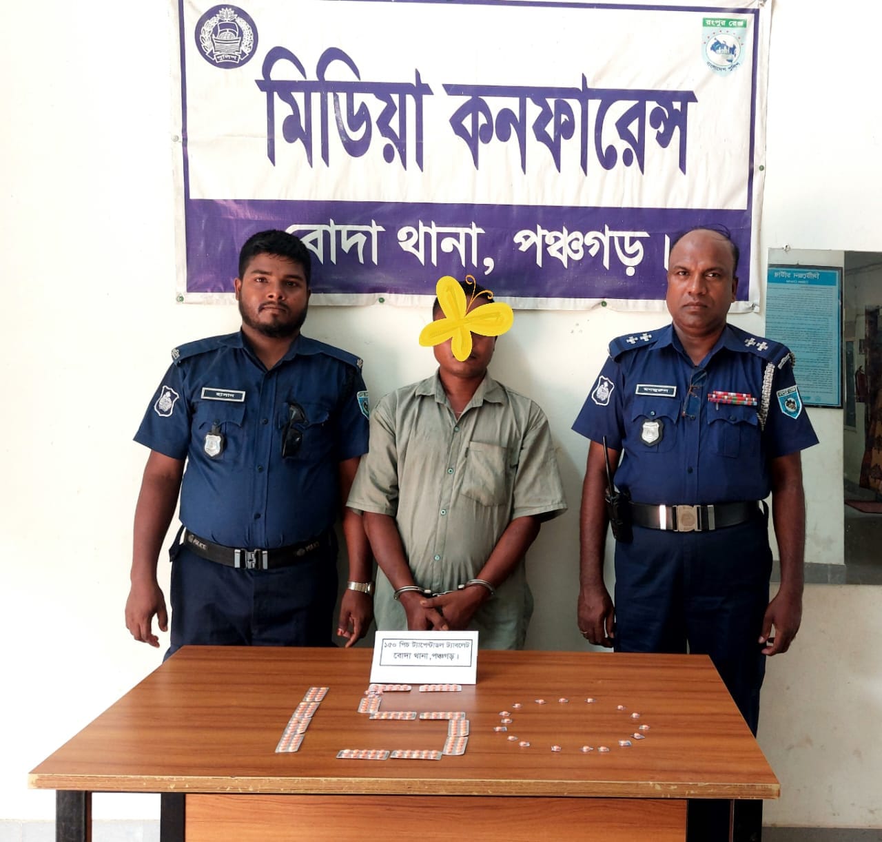 পঞ্চগড় জেলার সম্মানিত পুলিশ সুপার জনাব এস এম সিরাজুল হুদা পিপিএম-বার, সহকারী পুলিশ সুপার (বি-সার্কেল) জনাব রুনা লায়লা মহোদয়গনের দিক-নির্দেশনায় বোদা থানার অফিসার ইনচার্জ জনাব মোঃ মোজাম্মেল হক পিপিএম এর নেতৃত্বে বোদা থানার এসআই মোঃ বদিউজ্জামান, এসআই আব্দুস সালাম, এএসআই মোঃ সাজেদুর রহমান, এএসআই গোলাম মাহমুদ ও সঙ্গীয় ফোর্সের সমন্বয়ে গঠিত আভিযানিক দল বিশেষ অভিযান পরিচালনা করে ২৩/০৫/২০২৪ খ্রিঃ ২১.৫০ ঘটিকায় বোদা থানাধীন ০৩ নং বেংহারী বনগ্রাম ইউপির বোয়ালমারী গ্রামস্থ বোয়ালমারী বাজার হতে করতোয়া নদীর বারুনি ঘাটগামী ব্লক বসানো কাঁচা রাস্তার উপর নেশা জাতীয় মাদকদ্রব্য ট্যাপেন্ডাডল ট্যাবলেট বিক্রয়ের সময় আসামি ১। দয়ামন চন্দ্র বর্মন (৩৮), পিতা- মৃত রাজকুমার চন্দ্র বর্মন , সাং-মোড়ল পাড়া ,ডাকঘর আমতলা কাজিপাড়া, থানা-বোদা, জেলা-পঞ্চগড়কে ১৫০ পিচ ট্যাপেন্ডাডল ট্যাবলেট মাদকদ্রব্য সহ হাতে নাতে ধৃত করা হয়। এসআই মোঃ বদিউজ্জামান এর আনীত অভিযোগের প্রেক্ষিতে আসামি দয়ামন চন্দ্র বর্মন এর বিরুদ্ধে বোদা থানার মামলা নং-৩৩, তারিখ ২৩/০৫/২০২৪, ধারা -২০১৮ সালের মাদকদ্রব্য নিয়ন্ত্রণ আইনের ৩৬(১) সারণির ২৯(ক)/৪১ রুজু করা হয়। আসামিকে যথা সময়ে বিজ্ঞ আদালতে সোপর্দ্দ করা হয়েছে। পলাতক আসামিকে গ্রেফতারের চেষ্টা অব্যাহত রয়েছে। মাদকের বিরুদ্ধে বোদা থানা পুলিশের বিশেষ অভিযান অব্যাহত থাকবে।