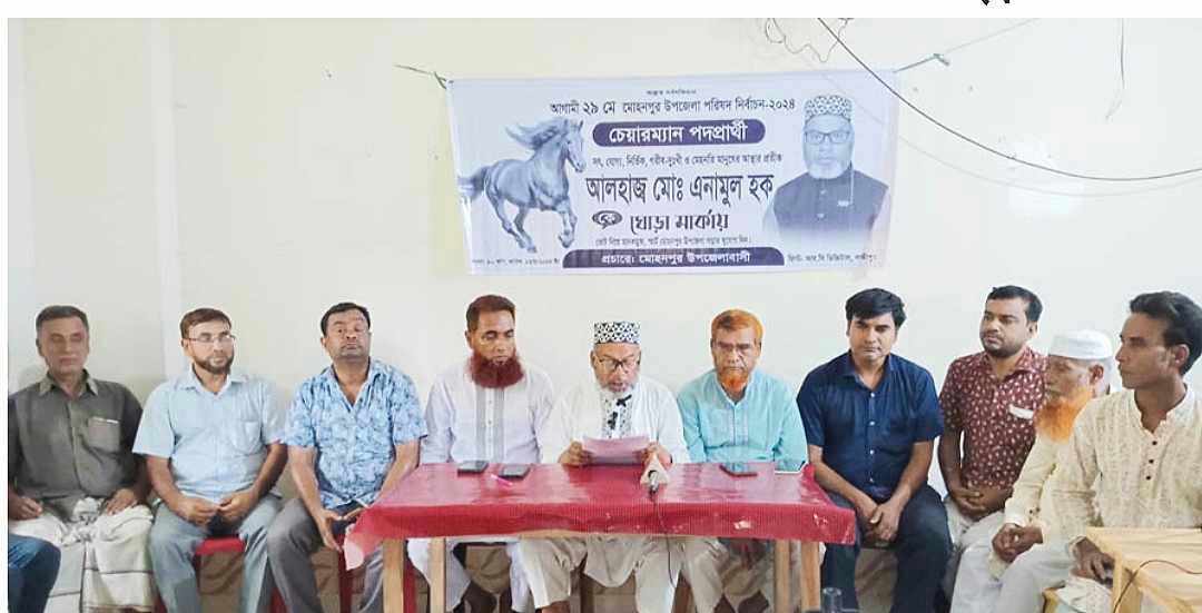 লা পরিষদ নির্বাচনে তৃতীয় ধাপে রাজশাহীর মোহনপুর উপজেলা পরিষদের নির্বাচনে ঘোড়া মার্কা প্রতীকের প্রার্থী চেয়ারম্যান আলহাজ্ব মোঃ এনামুল হক তার নির্বাচনী ইশতেহার ঘোষণা করেছেন।