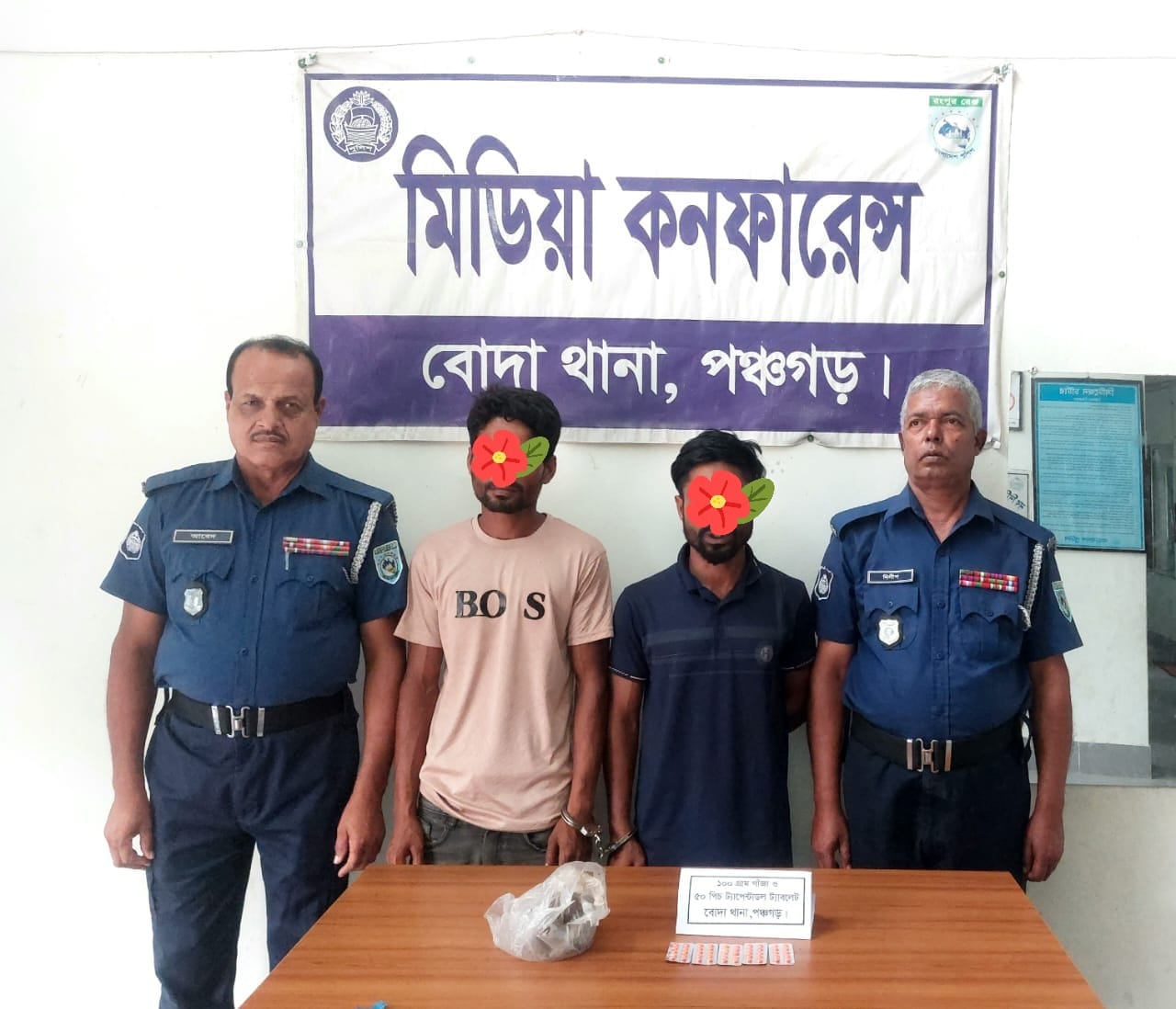 পঞ্চগড় জেলার সম্মানিত পুলিশ সুপার জনাব এস এম সিরাজুল হুদা পিপিএম-বার, সহকারী পুলিশ সুপার (বি-সার্কেল) জনাব রুনা লায়লা মহোদয়গনের দিক-নির্দেশনায় বোদা থানার অফিসার ইনচার্জ জনাব মোঃ মোজাম্মেল হক পিপিএম এর নেতৃত্বে বোদা থানার এসআই মোঃ বদিউজ্জামান, এএসআই মোঃ সাজেদুর রহমান, এএসআই বিষ্টু চন্দ্র রায় ও সঙ্গীয় ফোর্সের সমন্বয়ে গঠিত আভিযানিক দল বিশেষ অভিযান পরিচালনা করে ৩০/০৫/২০২৪ খ্রিঃ ০০.৪০ ঘটিকায় বোদা থানাধীন ০৩ নং বেংহারী বনগ্রাম ইউপির নতুনবন্দর ফুলতলা গ্রামস্ত মাদক ব্যবসায়ী মো: মামুনুর রশিদ ওরফে ডলার এর বসতবাড়ির ভিতর আঙ্গিনার পশ্চিম পাশের টিনের বেড়ার সাথে মাটিতে পুতা অবস্থায় নেশা জাতীয় মাদকদ্রব্য গাঁজা ও ট্যাপেন্টাডল ট্যাবলেট ক্রয়-বিক্রয়ের সময় আসামি ১। মোঃ মামুনুর রশিদ ওরফে ডলার (৩২), পিতা-মৃত শহিদুল ইসলাম , ২। মোঃ সোহেল রানা (২৮), পিতা- মৃত মাহিম উদ্দিন, উভয়ের সাং-নতুন বন্দর ফুলতলা , থানা- বোদা , জেলা-পঞ্চগড় দ্বয়কে মাদকদ্রব্য ১০০ গ্রাম গাঁজা ও ৫০ পিচ ট্যাপেন্টাডল ট্যাবলেট সহ হাতে নাতে ধৃত করা হয়। এসআই মোঃ বদিউজ্জামান এর আনীত অভিযোগের প্রেক্ষিতে আসামিদ্বয়ের এর বিরুদ্ধে বোদা থানার মামলা নং-৩৯, তারিখ ৩০/০৫/২০২৪, ধারা -২০১৮ সালের মাদকদ্রব্য নিয়ন্ত্রণ আইনের ৩৬(১) সারণির ১৯(ক)/২৯(ক)/৪১ রুজু করা হয়। আসামিদ্বয়কে যথা সময়ে বিজ্ঞ আদালতে সোপর্দ্দ করা হয়েছে। মাদকের বিরুদ্ধে বোদা থানা পুলিশের বিশেষ অভিযান অব্যাহত থাকবে।