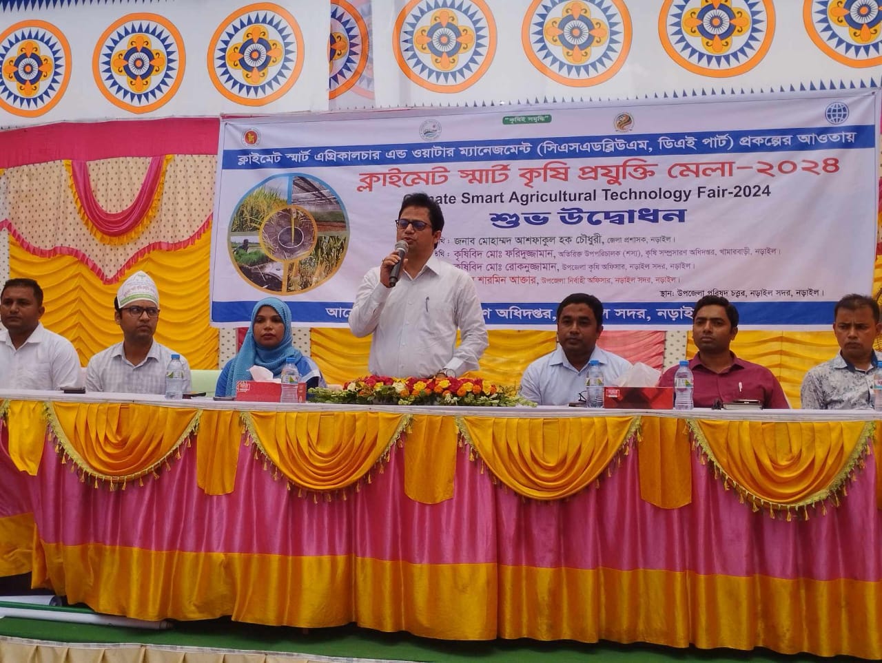 নড়াইলে ক্লাইমেট-স্মার্ট কৃষি প্রযুক্তি মেলা অনুষ্ঠিত হয়েছে। বৃহস্পতিবার(৬জুন) সদর উপজেলা পরিষদ চত্ত্বরে মেলা উদ্বোধন করেন জেলা প্রশাসক চৌধুরী আশফাকুল হক। সদর উপজেলা কৃষি বিভাগের আয়োজনে উদ্বোধনী অনুষ্ঠানে বক্তব্য রাভেন কৃষি সম্প্রসারন বিভাগের অতিঃ উপপরিচালক(শস্য) কৃষিবিদ মোঃ ফরিদুজ্জামান, সদর উপজেলা কৃষি অফিসার কৃষিবিদ মোঃ রোকুনুজ্জামান, উপসহকারী কৃষি কর্মকর্তা এ বি এম জাহিদ শাকিল। আয়োজনের সভাপতিত্ব করেন সদর উপজেলা নির্বাহী অফিসার শারমিন আক্তার।