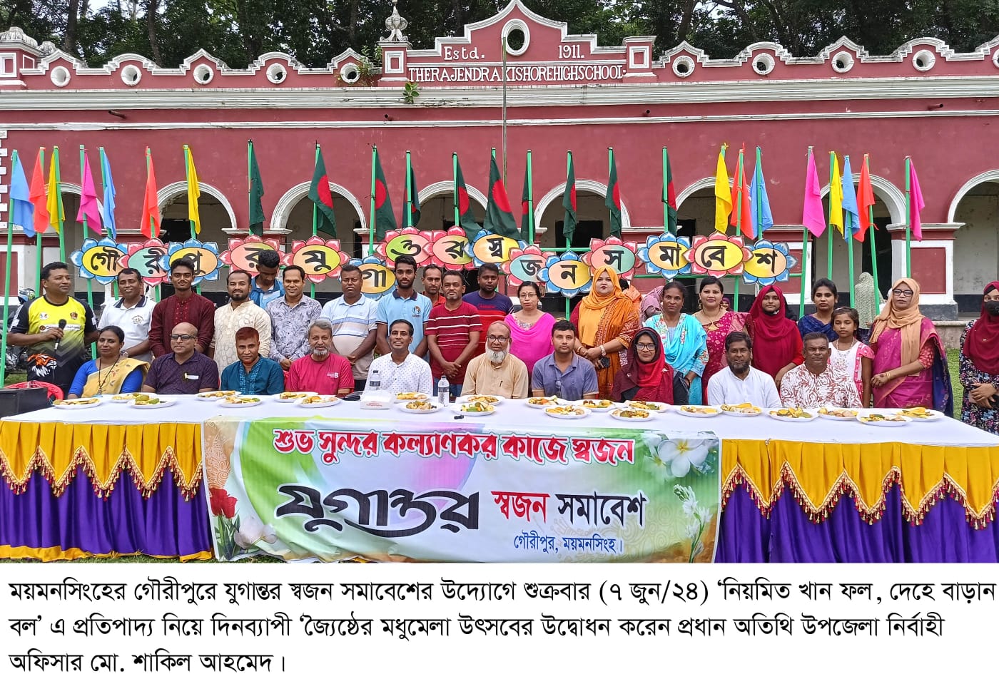 ময়মনসিংহের গৌরীপুরে যুগান্তর স্বজন সমাবেশের উদ্যোগে শুক্রবার (৭ জুন/২৪) রাজেন্দ্র কিশোর সরকারি উচ্চ বিদ্যালয় মাঠে ‘নিয়মিত খান ফল, দেহে বাড়ান বল’ এ প্রতিপাদ্য নিয়ে অনুষ্ঠিত হলো দিনব্যাপী ‘জ্যৈষ্ঠের মধুমেলা উৎসব’। মেলায় ২৮ প্রজাতির দেশীয় ফল প্রদর্শিত হয়।