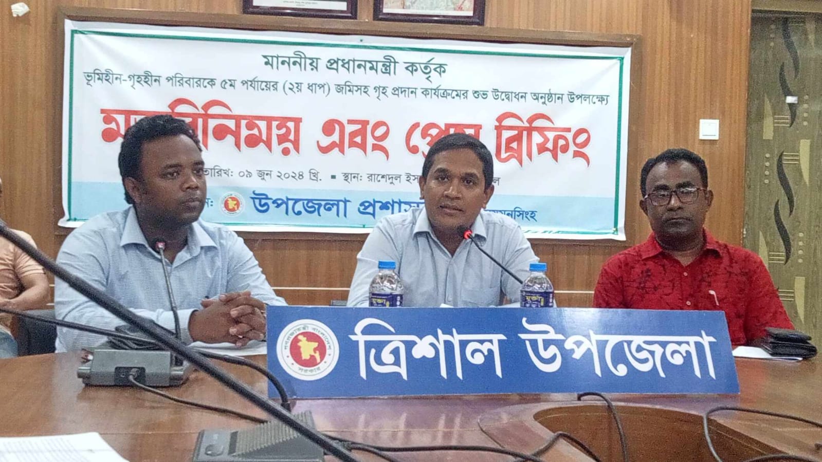 স্বাধীনতা মহান স্থপতি বঙ্গবন্ধু শেখ মুজিবুর রহমানের জন্মশতবার্ষিকী উপলক্ষে ত্রিশালে ভুমিহীদের মাঝে ১১জুন ৫ম পর্যায় ( ২য় ধাপে) প্রধানমন্ত্রীর উদ্বোধন উপলক্ষে মতবিনিময় ও প্রেস বিফিং করেছে ত্রিশাল উপজেলা নির্বাহী অফিসার জুয়েল আহমেদ।