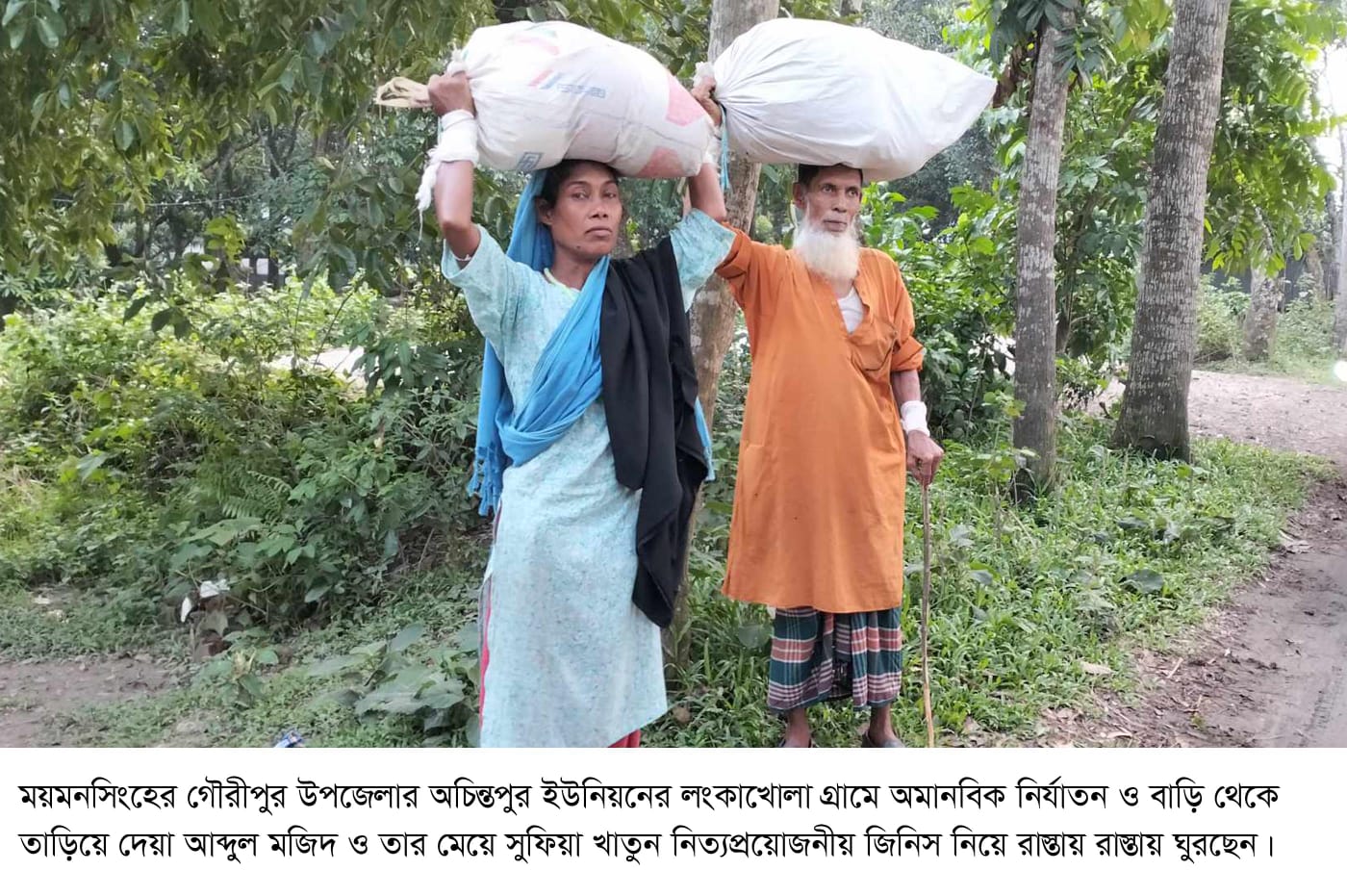 ‘বাবার সঙ্গে এ বাড়ি থেকে- ওইবাড়িতে ছুটছেন, নিজের বাড়িঘরে যেতে পারছেন না, এ যেন নিজ এলাকায় এখন পরবাস থাকছেন বাবা আব্দুল মজিদ ও তার মেয়ে সুফিয়া খাতুন। সাদা বস্তায় হাঁড়ি-পাতিল, তালা-বাসন ও বিছানাপত্র নিয়ে আজ একবাড়িতে, কাল অন্য বাড়িতে রাত্রিযাপন করছেন। মাথায় এ পুটলা নিয়ে নিত্যদিন ছুটিেত হচ্ছে তাদের। এ ঘটনা ঘটেছে ময়মনসিংহের গৌরীপুর উপজেলার অচিন্তপুর ইউনিয়নের লংকাখোলা গ্রামে।