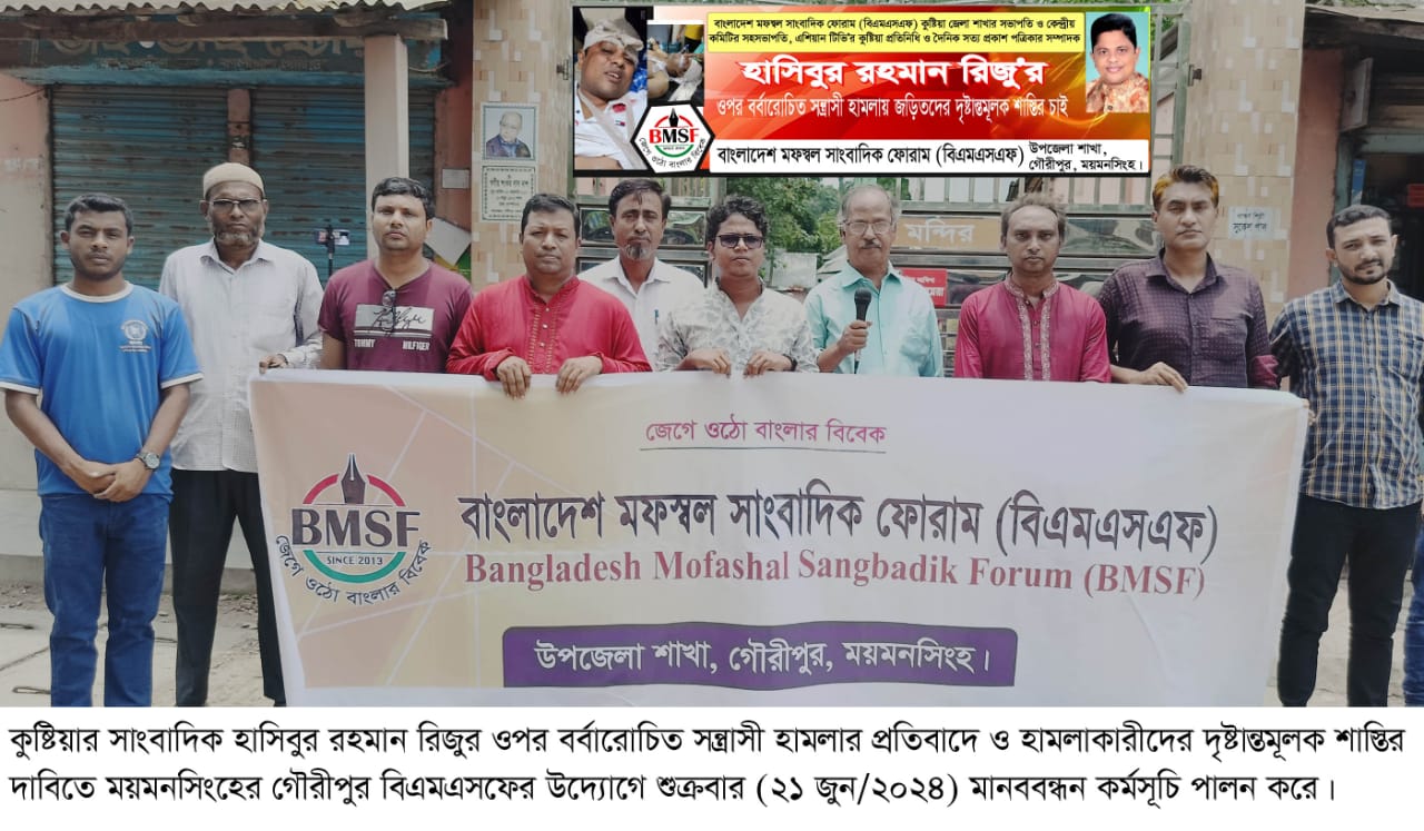 বাংলাদেশ মফস্বল সাংবাদিক ফোরাম (বিএমএসএফ) কুষ্টিয়া জেলা শাখার সভাপতি ও কেন্দ্রীয় কমিটির সহসভাপতি হাসিবুর রহমান রিজুর ওপর বর্বারোচিত সন্ত্রাসী হামলার প্রতিবাদে ও হামলাকারীদের দৃষ্টান্তমূলক শাস্তির দাবিতে ময়মনসিংহের গৌরীপুর বিএমএসফের উদ্যোগে শুক্রবার (২১ জুন/২০২৪) মানববন্ধন ও বিক্ষোভ মিছিল কর্মসূচি পালন করে।