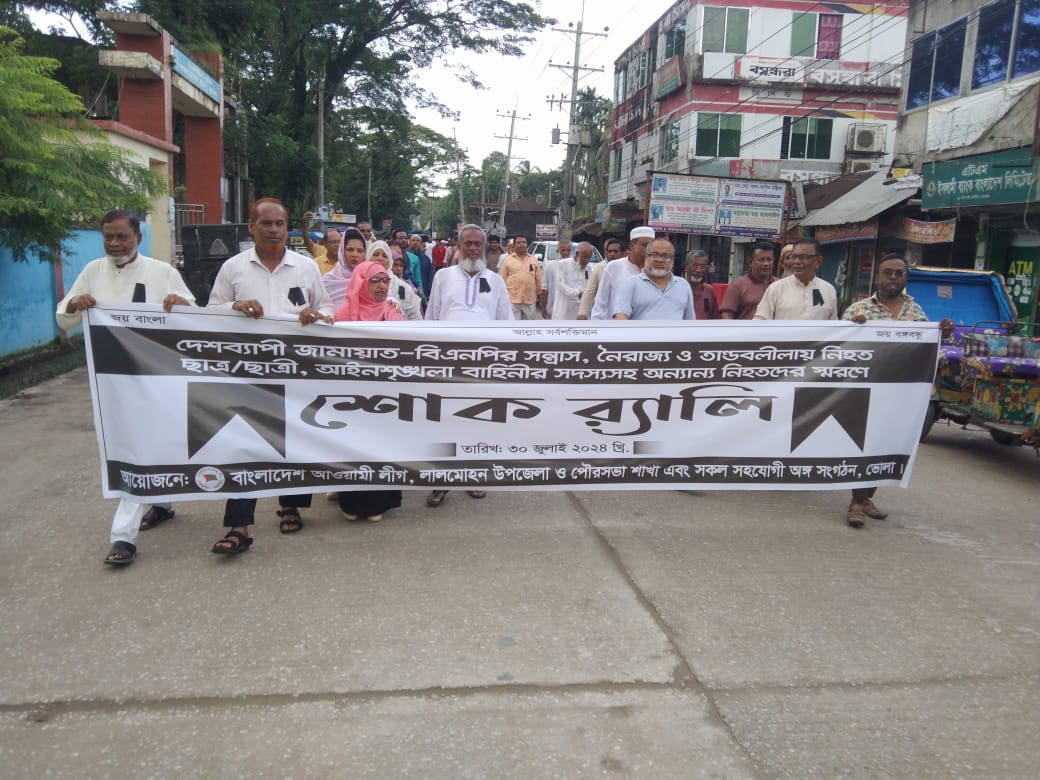 মঙ্গলবার বিকেলে উপজেলা আওয়ামী লীগ ও সহযোগী সংগঠনের আয়োজনে উপজেলা আওয়ামী লীগ কার্যালয়ের সামনে থেকে শোক র্যালি বের করা হয়। র্যালিটি লালমোহন বাজারের বিভিন্ন গুরুত্বপূর্ণ সড়ক প্রদক্ষিণ শেষে বাজারের চৌরাস্তায় এসে সমবেত হয়। পরে সেখানে সংক্ষিপ্ত সমাবেশ অনুষ্ঠিত হয়।