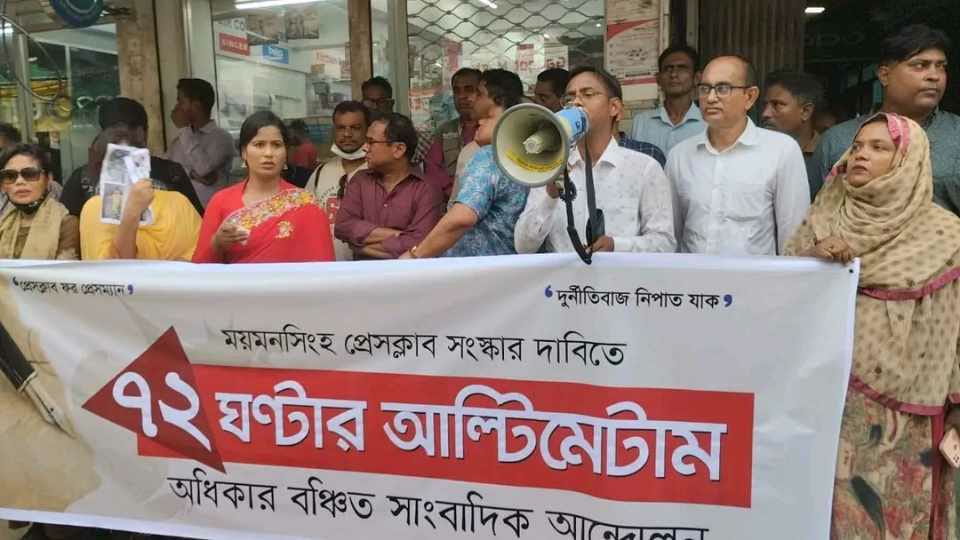 ময়মনসিংহে গঠিত অধিকার বঞ্চিত সাংবাদিক আন্দোলনের ৪০ সমন্বয়ক ময়মনসিংহ প্রেসক্লাব সংস্কারের ৭২ ঘণ্টার আল্টিমেটাম দিয়ে প্রশ্নবিদ্ধ কমিটি বিলুপ্ত ঘোষণা করেছেন। এর মধ্যে ১১ সমন্বয়ক ও ২৯ সহ- সমন্বয়ক রয়েছেন। দীর্ঘ ৪ যুগ কুক্ষিগত ও এক তরফা নিয়মে দখলে রাখা প্রেসক্লাবের দায়িত্ব পেশাদার ও প্রকৃত সাংবাদিকদের কাছে হস্তান্তর করার দাবি জানানো হয়। বেঁধে দেওয়া সময়ের মধ্যে পেশাদার ও প্রকৃত সাংবাদিকদের অধিকার নিশ্চিত করার অনুরোধ জানানো হয়েছে। সংস্কারের মাধ্যমে দেশের অন্য প্রেসক্লাবের মতো ময়মনসিংহ প্রেসক্লাবকে পরিচ্ছন্ন প্রতিষ্ঠানে পরিণত করার দাবি জানানো হয়। এ সময় ভিন্ন পেশার লোকজনের সদস্য পদ বাতিল করতে বলা হয়েছে। অন্যথায় যেকোনো অনাকাঙ্খিত পরিস্থিতির জন্য প্রশ্নবিদ্ধ ব্যক্তিরা দায়ী থাকবেন বলে কঠোর হুশিয়ারী উচ্চারণ করে জানিয়ে দেওয়া হয়।
