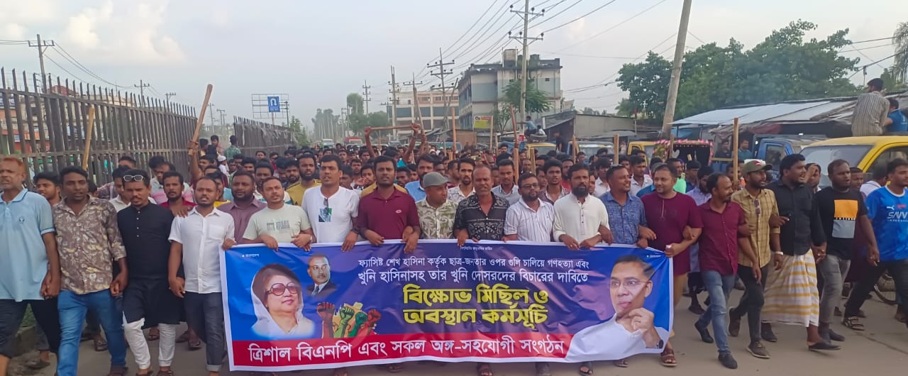 শেখ হাসিনা কর্তৃক ছাত্র ও জনতার উপর গুলি চালিয়ে গণহত্যা এবং শেখ হাসিনা সহ তার দোসরদের সর্বোচ্চ বিচারের দাবিতে ময়মনসিংহের ত্রিশালে বৃহস্পতিবার বিকেলে এক বিশাল বিক্ষোভ মিছিল করেছে জাতীয়তাবাদী ছাত্রদল, যুবদল, তাঁতী দল, স্বেচ্ছাসেবক দল, ও কৃষকদলের নেতাকর্মীরা।