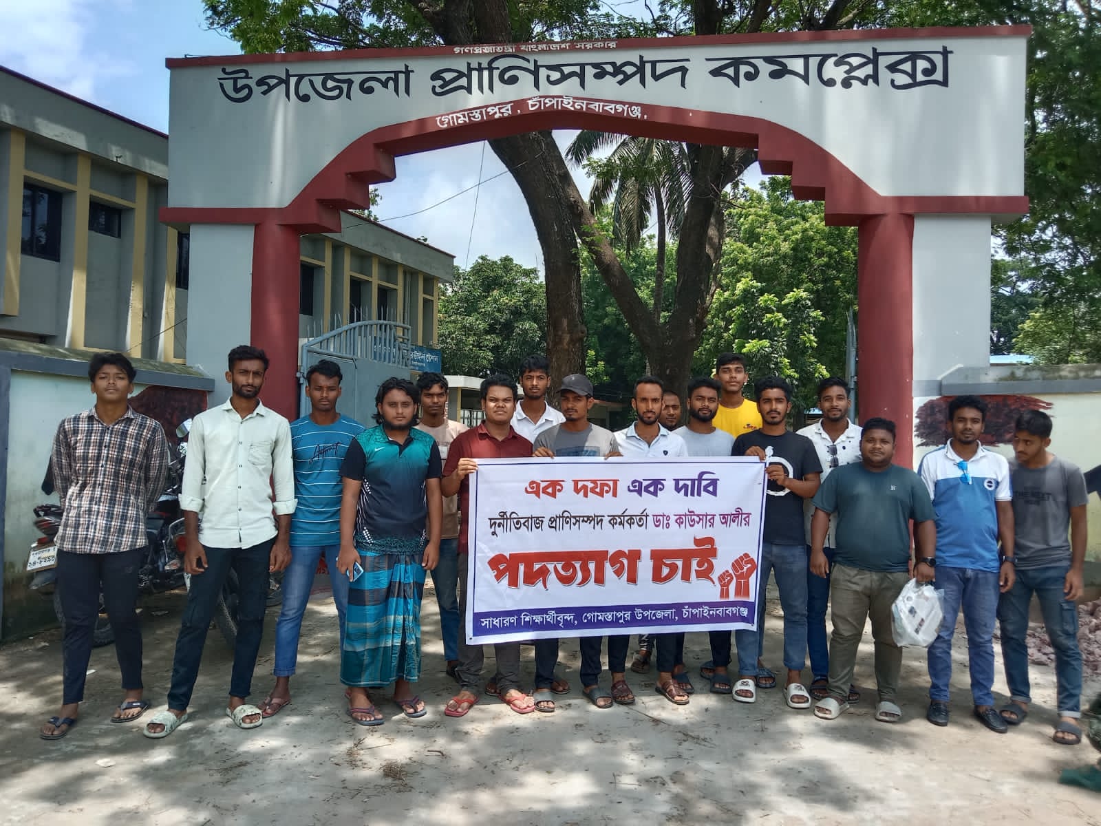 চাঁপাইনবাবগঞ্জের গোমস্তাপুরে উপজেলা প্রানিসম্পদ কর্মকর্তা ডাঃ কাউসার আলিকে অপসারনের দাবিতে মানববন্ধন করেছে সাধারণ শিক্ষার্থীরা।