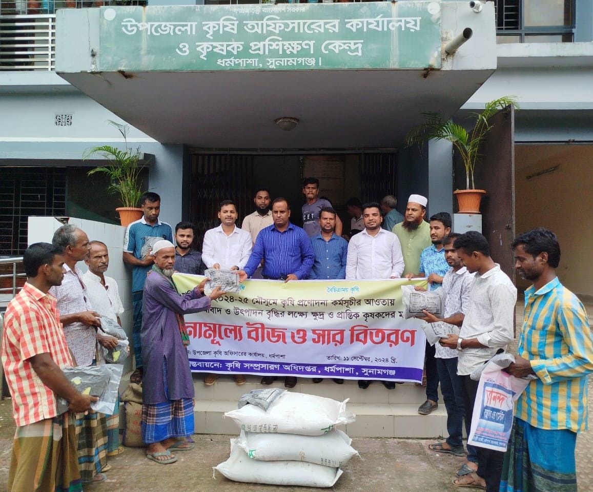 সুনামগঞ্জের ধর্মপাশা উপজেলায় প্রান্তিক কৃষকদের মধ্যে বিনা মূল্যে সার ও বীজ বিতরণ অনুষ্ঠিত হয়েছে।১১সেপ্টেম্বর বুধবার সকাল পৌনে ১১টার দিকে উপজেলা কৃষি কর্মকর্তার কার্যালয় প্রাঙ্গণে কৃষি প্রণোদনা কর্মসূচির আওতায় উপজেলা কৃষি সম্প্রসারণ অধিদফতর এই অনুষ্ঠানের আয়োজন করে। উপজেলার বিভিন্ন ইউনিয়ন থেকে আগত ৬০ জন কৃষক নিয়ে বিতরণের মূল কার্যক্রম শুরু হয়।এতে প্রধান অতিথি ছিলেন উপজেলা নির্বাহী কর্মকর্তা (ইউএনও) মোহাম্মদ গিয়াস উদ্দীন। এ সময় অন্যদের মধ্যে সেখানে উপস্থিত ছিলেন উপজেলা কৃষি কর্মকর্তা আবদুল্লাহ আল মাসুদ, কৃষি সম্প্রসারণ কর্মকর্তা মো.শাহ আলম, উপজেলা প্রকল্প বাস্তবায়ন কর্মকর্তা আবদুল মোত্তালেব সরকার,উপসহকারী উদ্ভিদ সংরক্ষণ কর্মকর্তা কামরুল হাসান প্রমুখ।পরে মাসকলাই উৎপাদন বৃদ্ধির লক্ষ্যে উপস্থিত কৃষকদের মাঝে, ৫ কেজি মাসকলাই বীজ, ১০ কেজি ডিএপি ও ৫ কেজি এমওপি সার বিতরণ করা হয়।