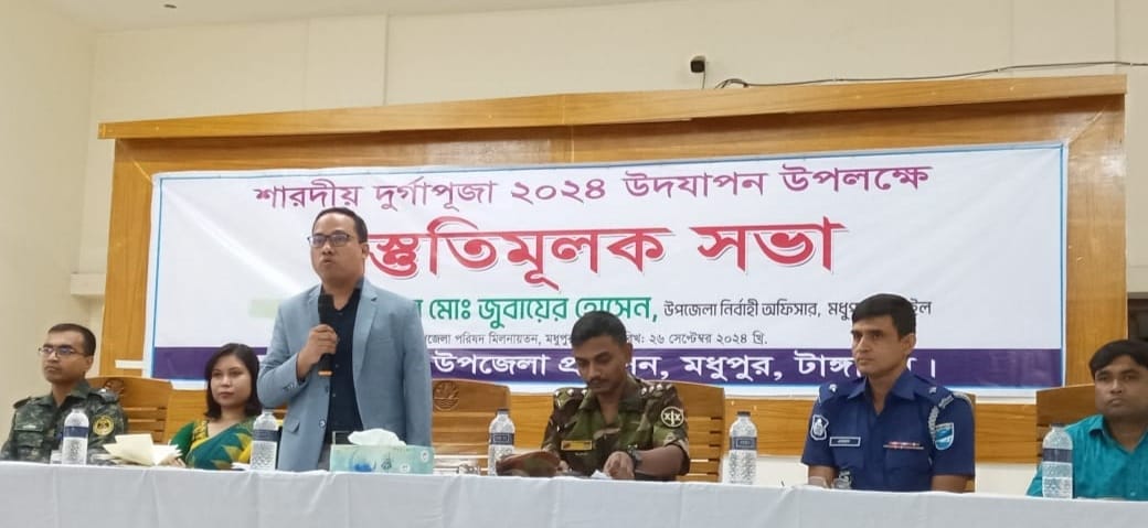 এতে সভাপতিত্ব করেন মধুপুর উপজেলা নির্বাহী কর্মকর্তা মো. জুবায়ের হোসেন। সভায় বক্তব্য দেন মধুপুরের দায়িত্বপ্রাপ্ত কমান্ডার ক্যাপ্টেন মাইদুর রহমান, সহকারি কমিশনার ভ‚মি রিফাত আনজুম পিয়া, মধুপুর থানার ভারপ্রাপ্ত কর্মকর্তা ইমরানুল কবীর, আনসার কমান্ডার কামরুজ্জামান, দূর্গাপূজা উদযাপন কমিটির সভাপতি সুশীল চন্দ্র দাস, সাধারণ সম্পাদক সাধন মজুমদার প্রমূখ।